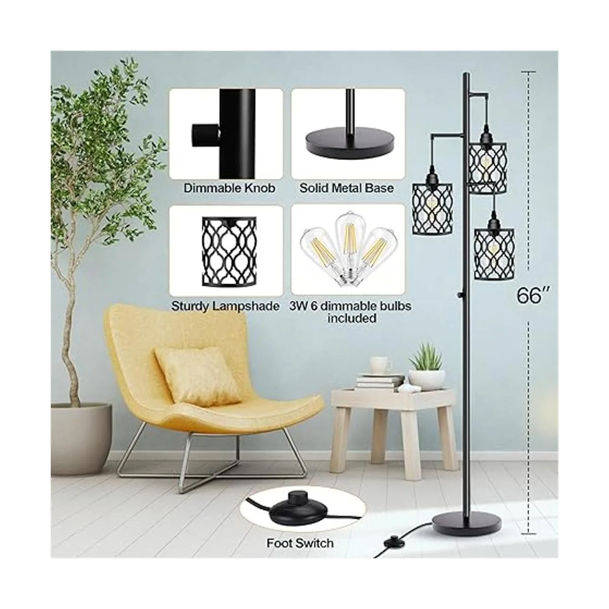 Material de alta calidad y base de metal resistente: esta lámpara de pie de 3 luces está hecha de materiales de alta calidad para crear una base pesada y estable y un poste ligero para garantizar la estabilidad incluso en la alfombra. Tres jaulas ligeras son firmes y resistentes, nunca se doblan. La base es lo suficientemente confiable, no te importa que se caiga debido a un signo de perturbación o problema. Es muy seguro de usar, especialmente para niños o mascotas.