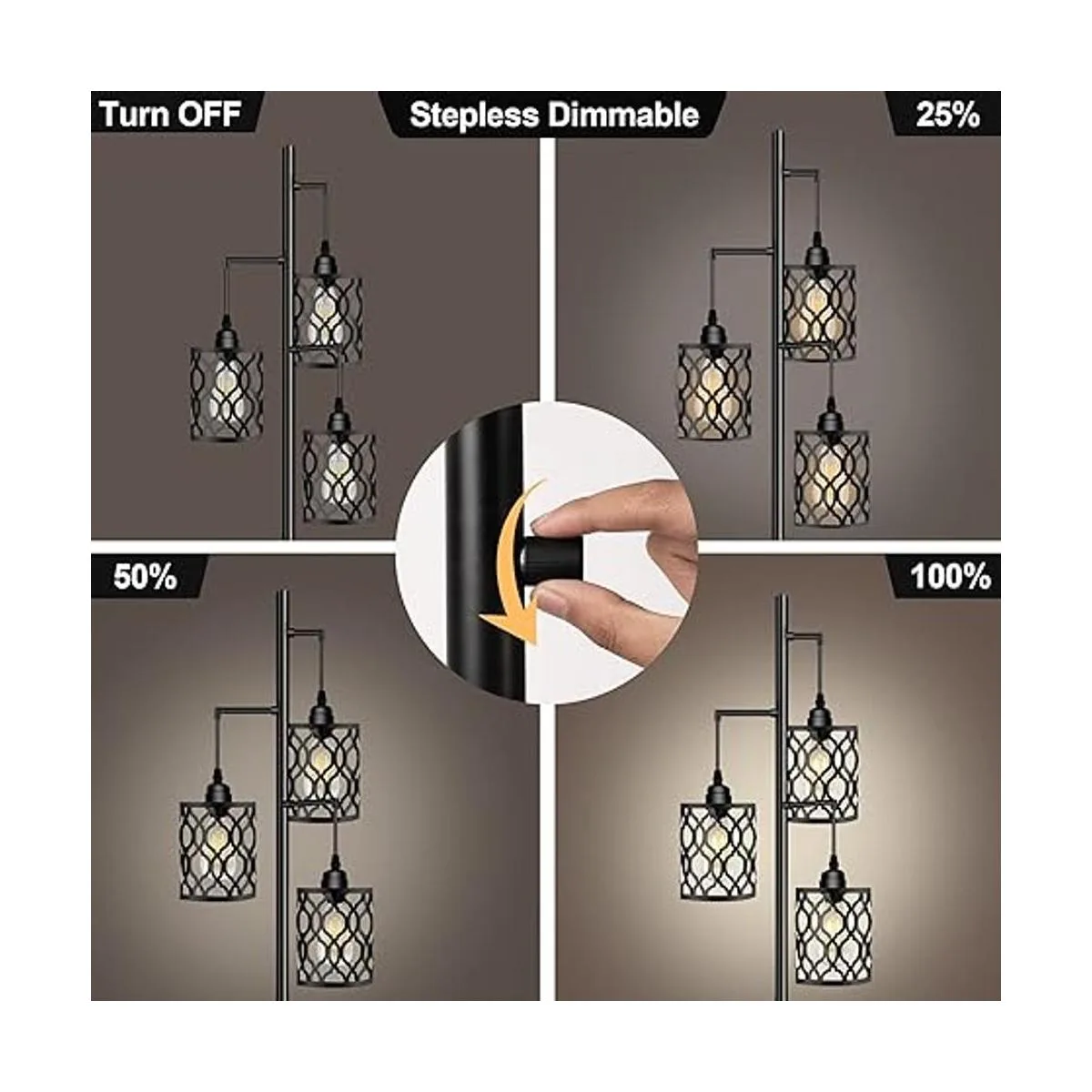 Lámpara de pie de atenuación continua 0100: esta lámpara alta para la sala de estar se actualiza con un interruptor regulable sin pasos e interruptor de pie para controlar el brillo. Simplemente gírala y luego puedes ajustar la lámpara de pie en el rango de brillo de 0 a 100 de acuerdo a las necesidades de diferentes escenas. El práctico interruptor de pie ahorra espacio y ofrece el funcionamiento manos libres, lo que te permite multitarea.