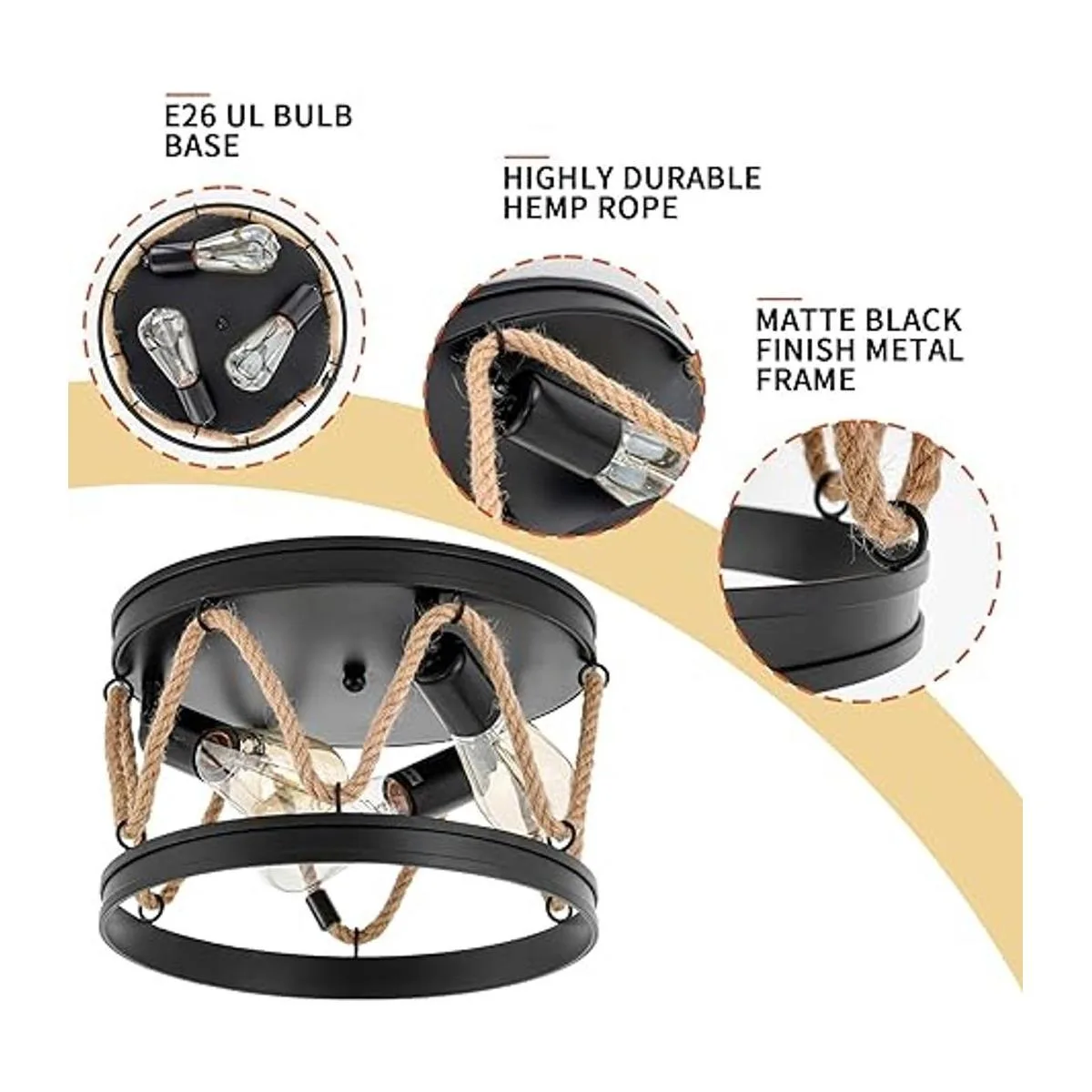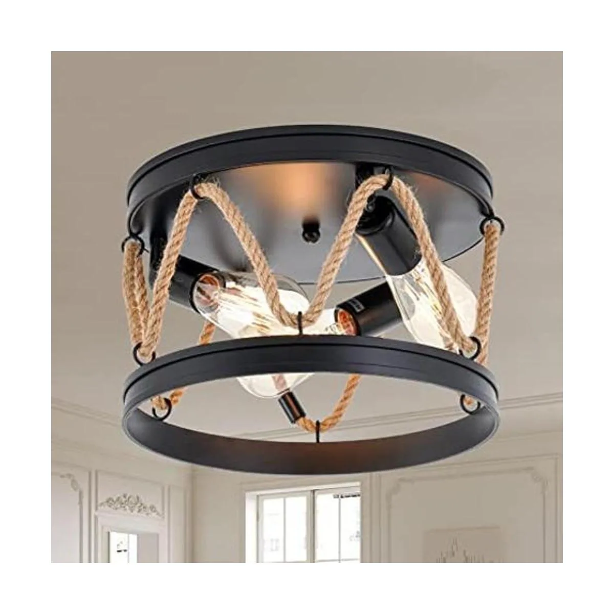 Lámpara de techo industrial empotrada, lámpara de techo de 3 luces con pantalla de cuerda, lámpara de techo redonda de metal negro para comedor, pasillo, vestíbulo, dormitorio y entrada