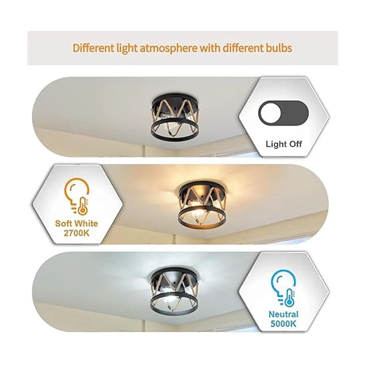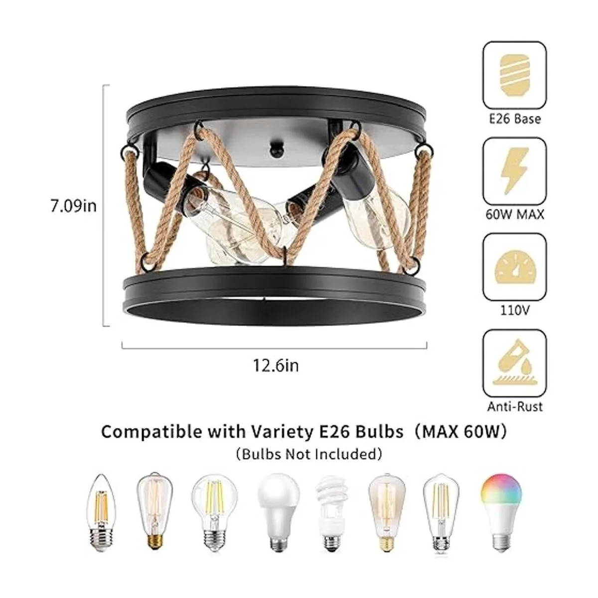 Tamaño y bombillas recomendadas: las luces para dormitorio miden 12.6 pulgadas de profundidad x 7.09 pulgadas de alto y vienen en un embalaje seguro para tu propia comodidad. Cuenta con un enchufe de bombilla UL E26 resistente al calor bombilla no incluida, esta lámpara de techo vintage utiliza 3 bombillas E26 máximo 60 W cada enchufe; funciona con LED, CFL, bombilla incandescente, luz negra ofrecerá mucha luz a tus habitaciones y traerá un campo cómodo para brillar. Para completar la función de atenuación si tienes un interruptor de atenuación, utiliza bombillas regulables.