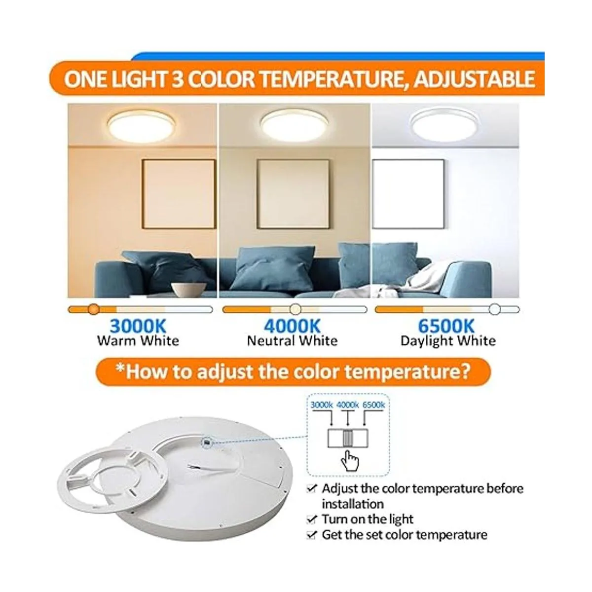 Instalación de iluminación de montaje empotrado: la luz LED redonda delgada de panel plano puede montaje empotrado y montaje en superficie para cualquier zona de techo. Fácil instalación puede ser fácilmente hecho por una persona, primero instala la base en el techo, y la lámpara de techo se puede fijar con tornillos. Consejos: antes de la instalación, consulta la imagen del anuncio del interruptor, ajusta la temperatura del color.