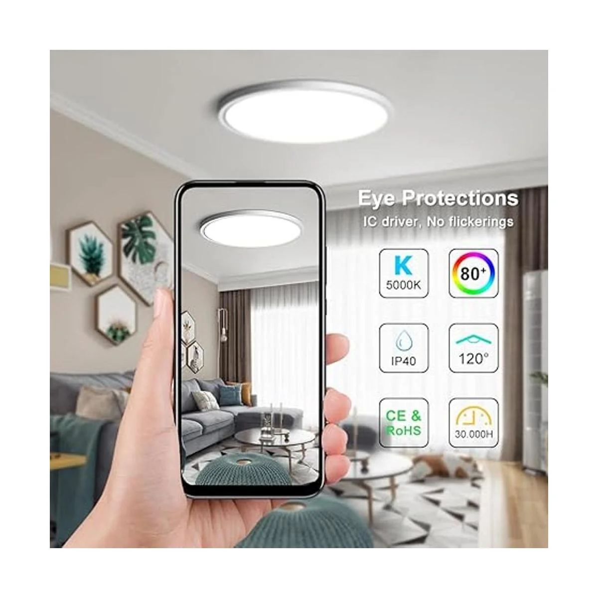Ahorro de energía: la lámpara de techo LED plana de 24 W equivale a las bombillas fluorescentes tradicionales de 240 W. Si está bajo un uso normal de 8 horas al día, la vida útil podría soportar más de 10 años.
