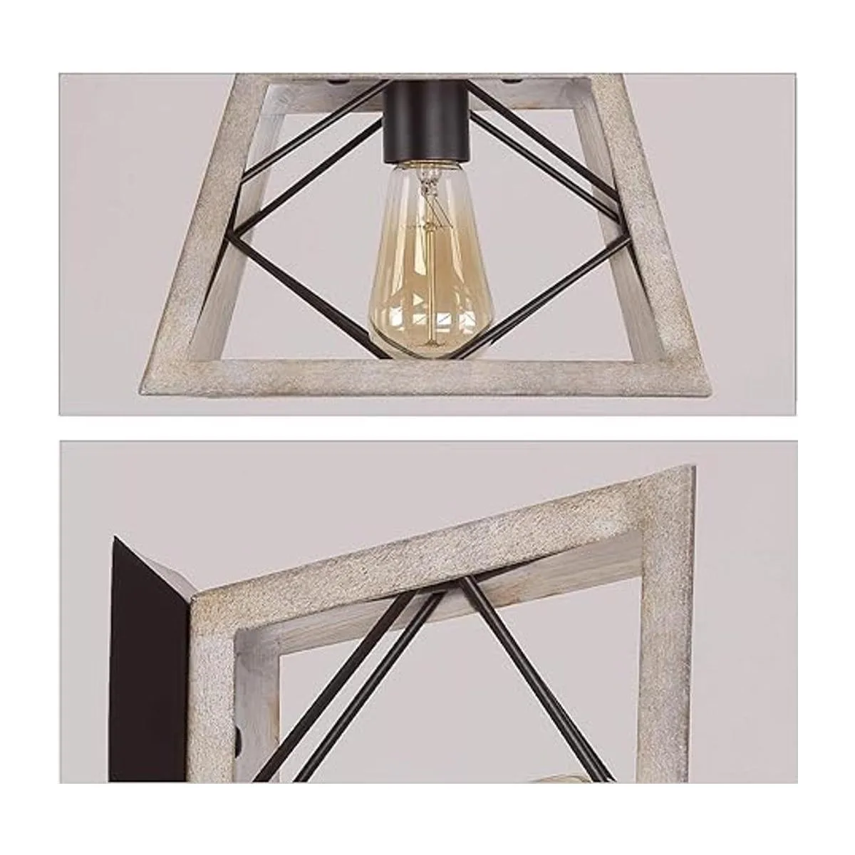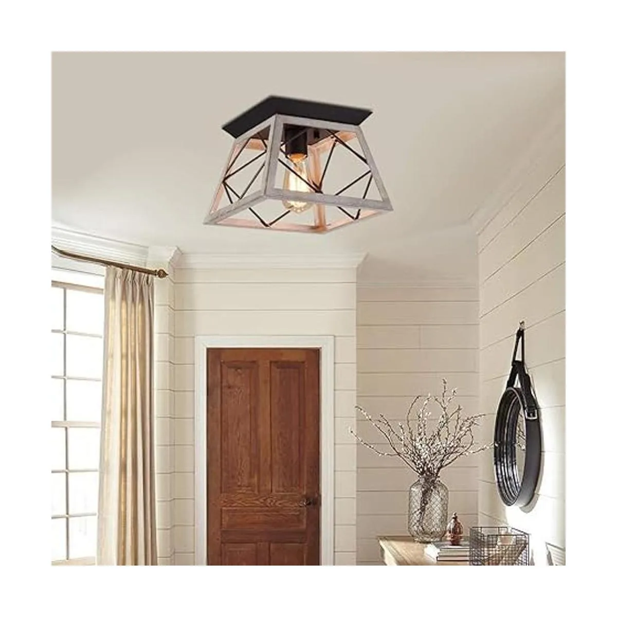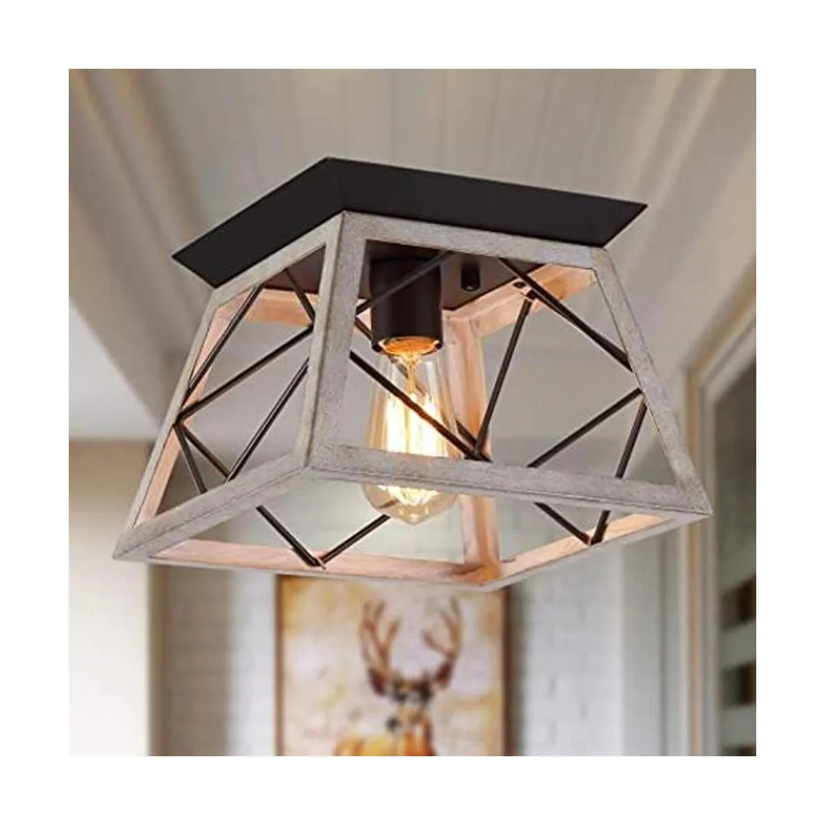 Diseño industrial urbano: La lámpara de techo rústica utiliza un marco de metal fabricado y duradero con acabado de roble blanco para ofrecerte una sensación campestre, antigua y tradicional. Con una forma cuadrada y un diseño de jaula de hierro que le da un aspecto retro, artístico y encantador. La lámpara de techo de casa de campo puede crear un ambiente acogedor, natural y romántico