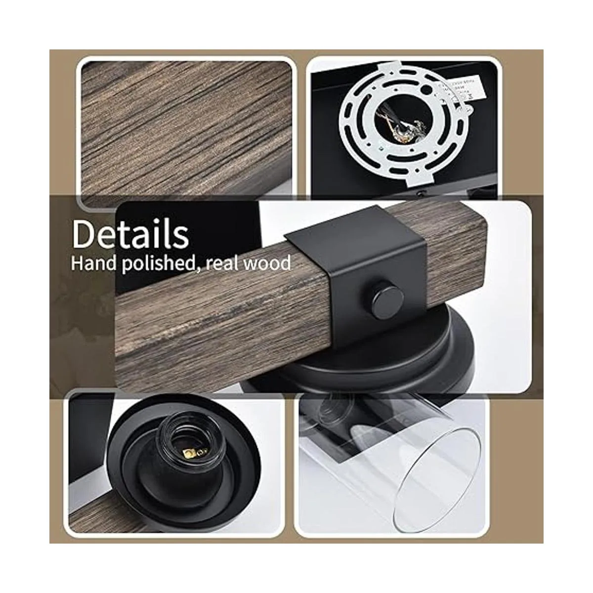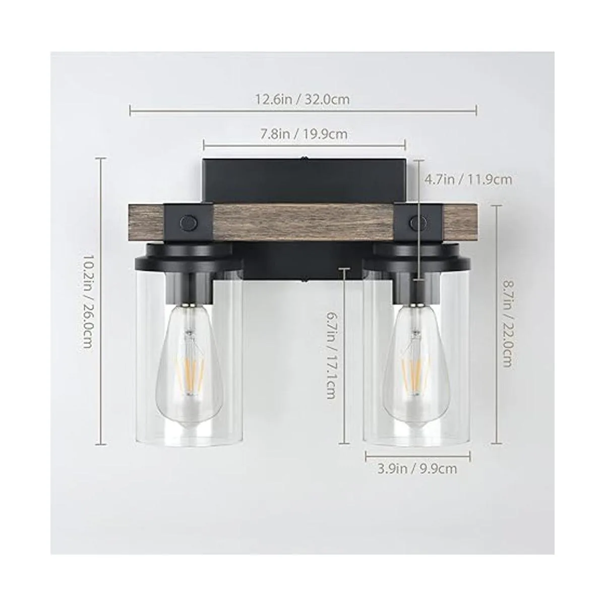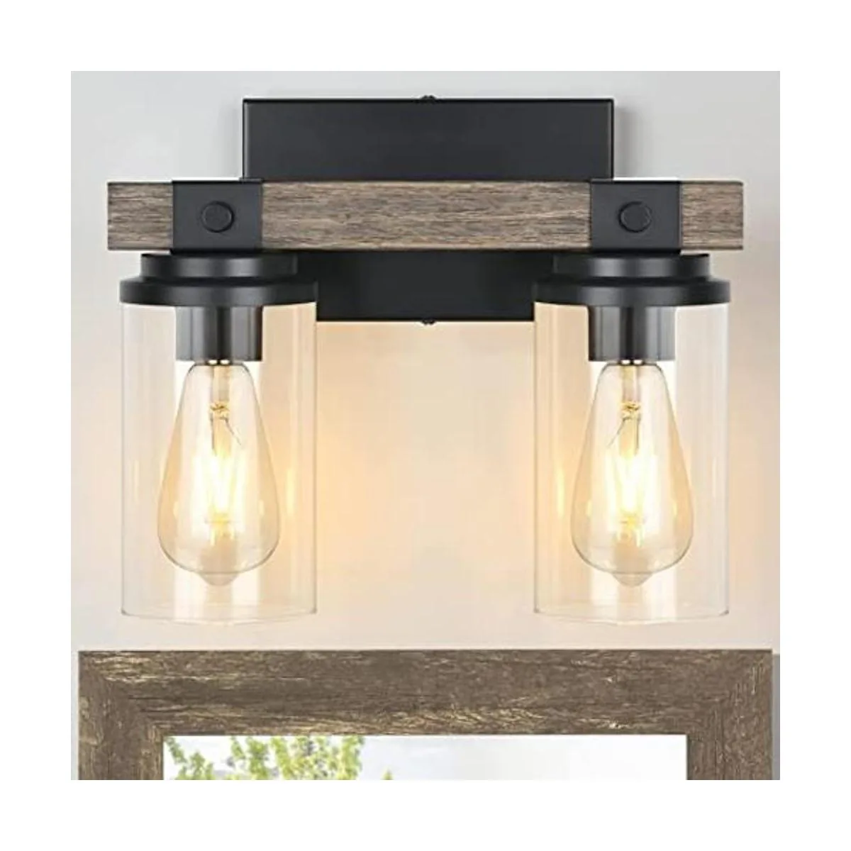 Lámparas de baño de granja, iluminación de tocador negra de madera con 2 luces, aplique de pared de madera industrial, rústico, sobre espejo con pantalla de vidrio transparente para baño, pasillo, cocina, dormitorio