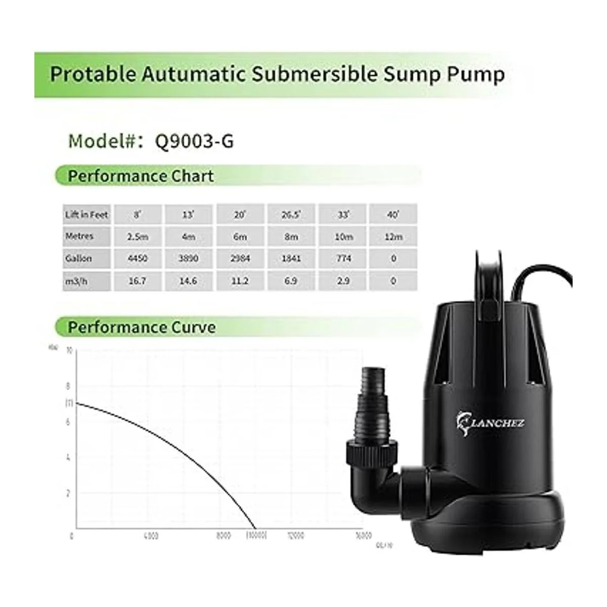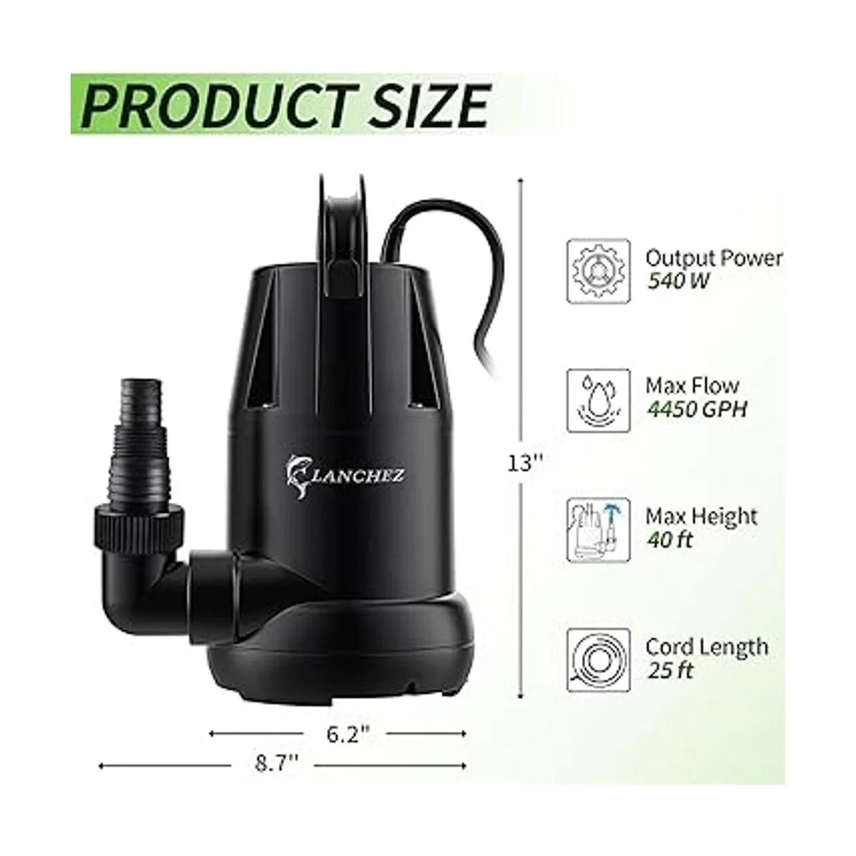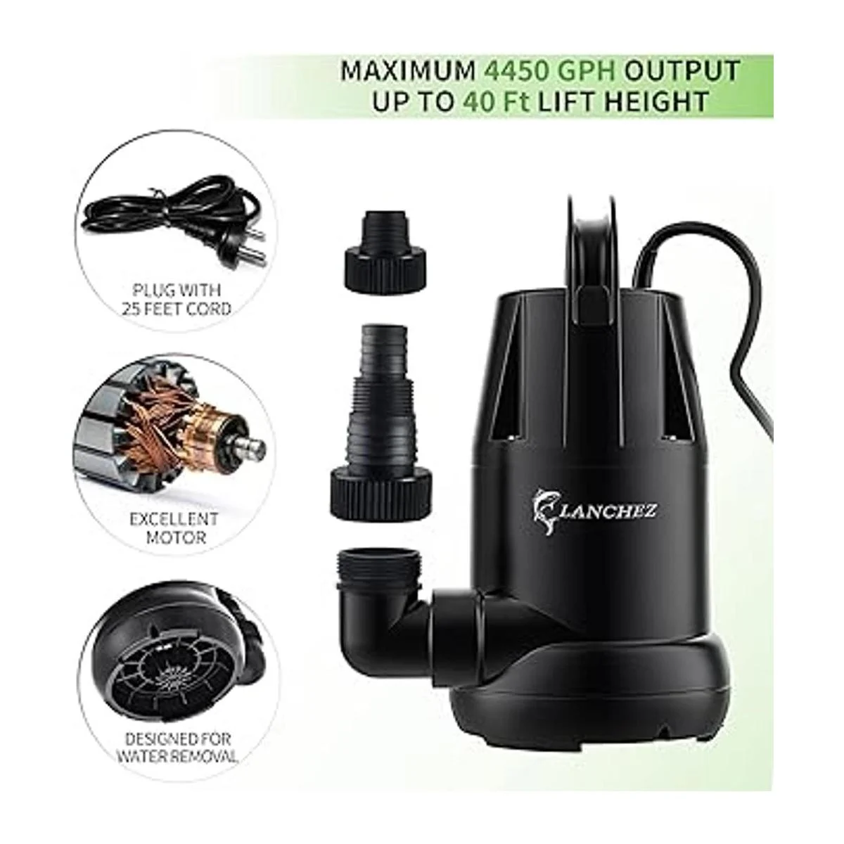 Lanchez Bomba de sumidero sumergible de 34 HP 4450 GPH, bomba de utilidad para eliminación de agua limpiasucia, bomba de agua de transferencia para piscina, jardín, estanque, sótano, bomba de drenaje para drenaje de casa inundada de respaldo