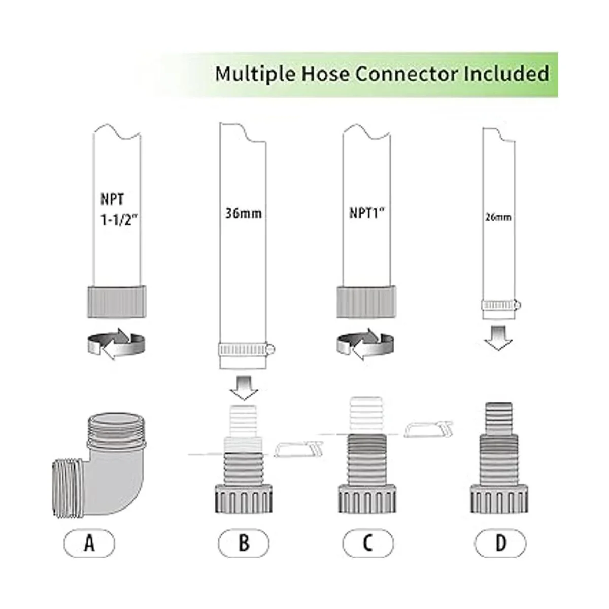 Accesorios profesionales: la bomba de fuente con asscessories. Construcción de plástico resistente y resistente a la corrosión para mayor durabilidad; descarga NPT de 1 pulgada; adaptador de manguera incluido para mangueras de 11/2, 11/4 o 1 pulgada.