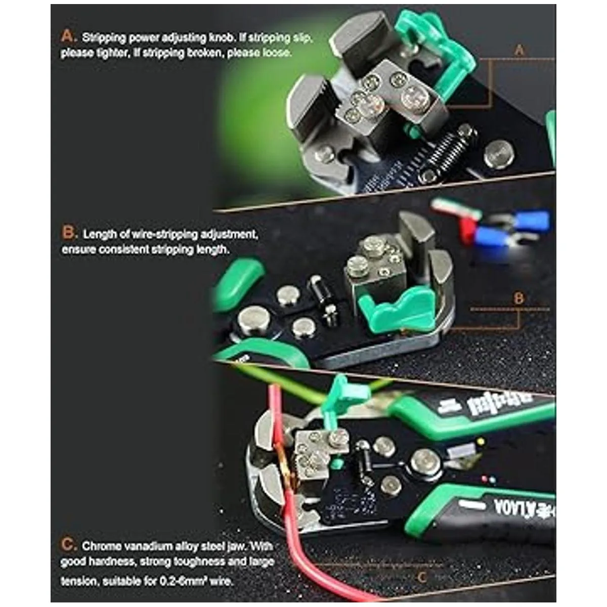 Mandíbula de acero de aleación de cromo vanadio. Con buena dureza, fuerte dureza y gran tensión, adecuado para cables AWG 826.