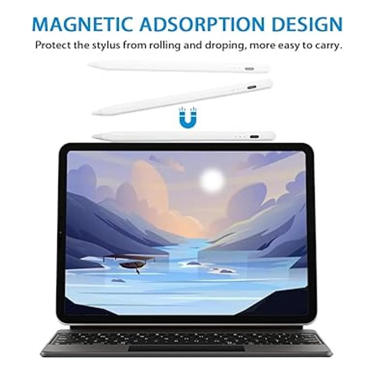 Rechazo de palma y absorción magnética: la tecnología de rechazo de palma proporciona una escritura natural con la pantalla táctil de la tableta, puedes descansar cómodamente tus manos en el iPad, sin necesidad de usar guantes. El diseño magnético protege el Apple Pen de rodar y caer, hace que el lápiz capacitivo activo sea más fácil de transportar y organizar.