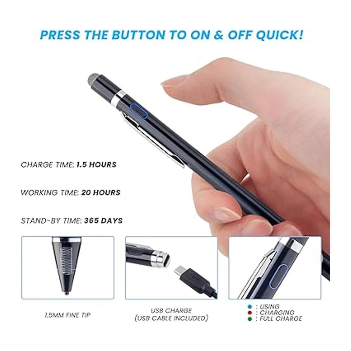 Acerca del lápiz capacitivo Fino, ligero, diseño elegante con 5.748 in de longitud, 0.47 oz de peso, punta de 0.059 in para escribir y dibujar sin problemas. Más sensible con largo tiempo de uso en el mejor rendimiento. Gran opción de lápiz capacitivo C330/630 Chromebook para artistas, periodistas, profesores y estudiantes, etc.