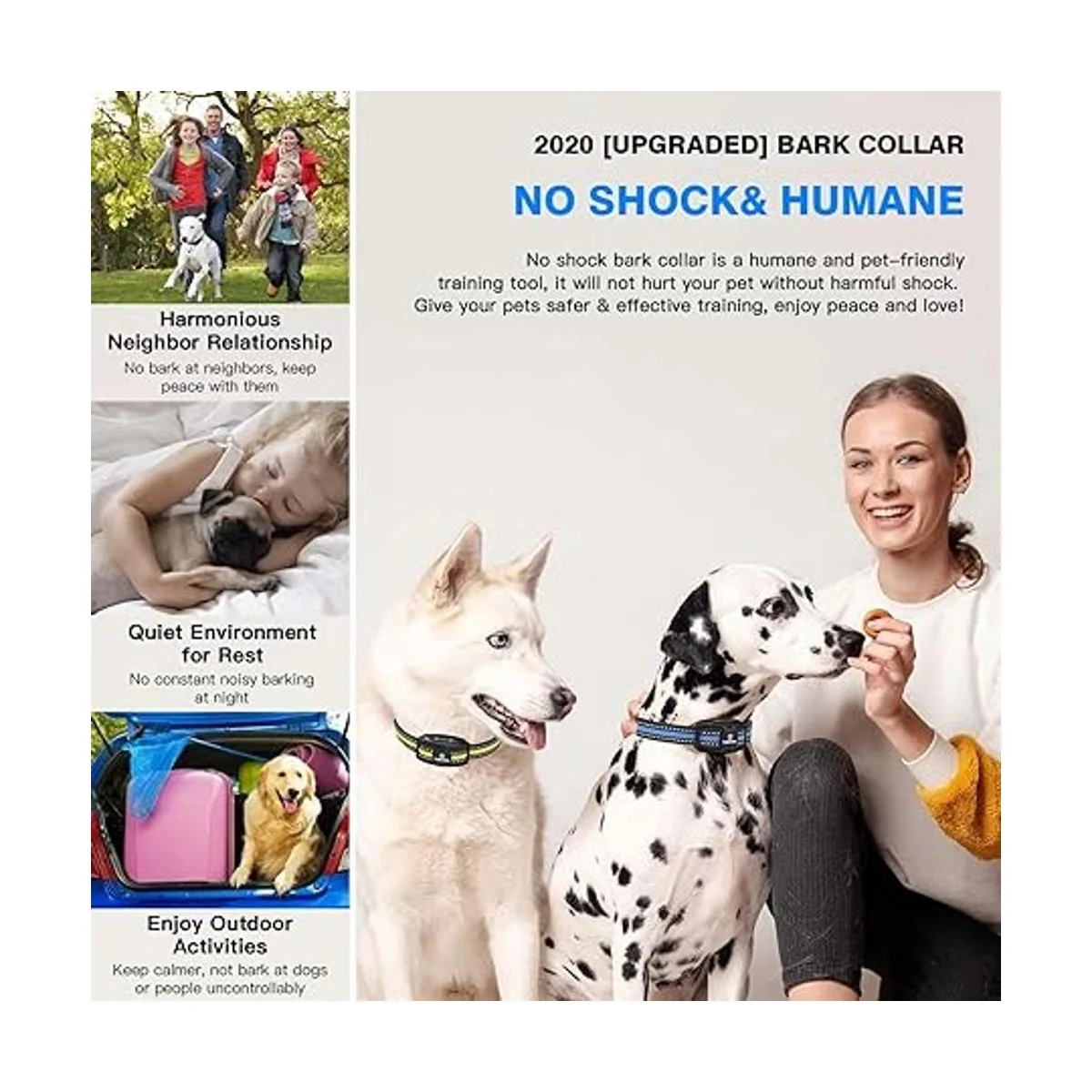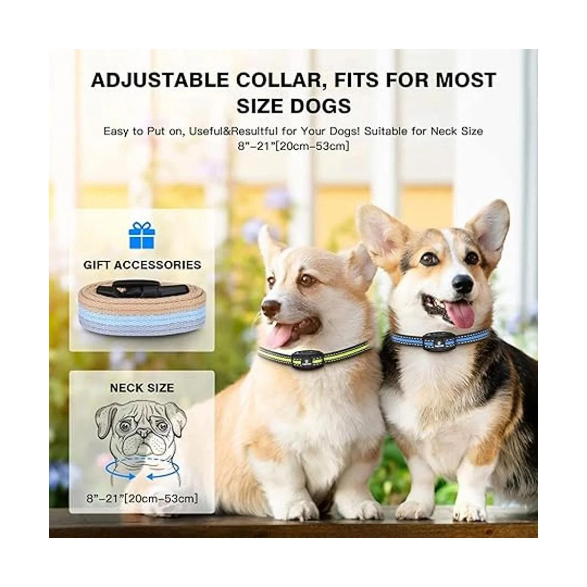 Diseños aptos para mascotas: con el fin de mejorar la comodidad de uso para los perros, el collar de corteza más nuevo es más ligero, y proporcionamos 3 correas de nailon diferentes suaves y duraderas con rayas reflectantes, que aumentarán la seguridad de tu perro y los harán visibles en entornos oscuros. La correa del cuello es ajustable para cuello de 8 a 21 pulgadas 7.9 in20.9 in. Se incluyen 3 pares de fundas de silicona suave, que pueden tocar fácilmente la piel del perro a través del pelo del perro, proteger la piel de la mascota.