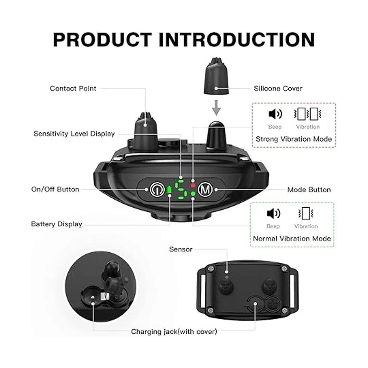 2 modos de entrenamiento humano y 5 niveles de sensibilidad: pulsa M para modo de interruptor rápido, indicador verde para modo de pitido vibración, rojo para pitido modo de vibración fuerte. El fuerte poder de vibración atraerá la atención del perro y les ayudará a corregir el problema de ladridos sin golpes dolorosos. Pulsa el botón de encendido para elegir el nivel de sensibilidad de 1 a 5, ajústalo de acuerdo con el entorno y tus necesidades reales, cuanto mayor sea el nivel, más sensible será el sensor de activación, más rápida será la velocidad de arranque