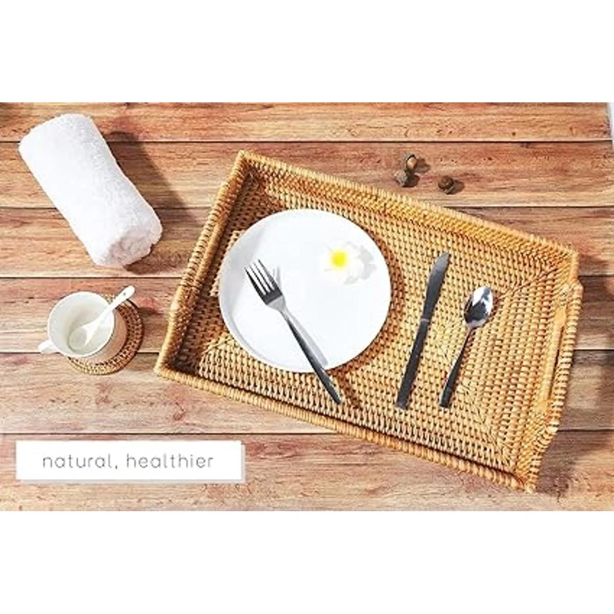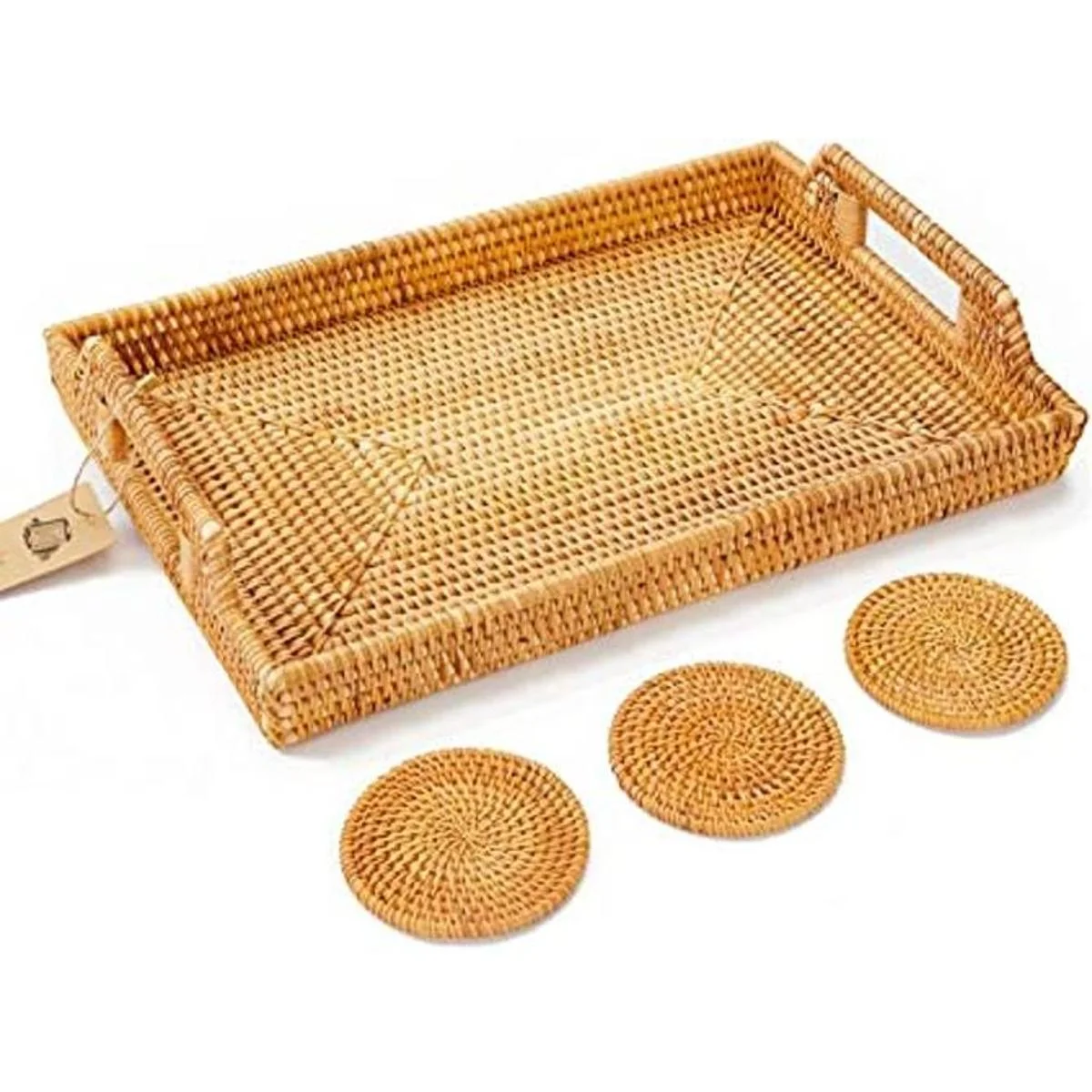 Large Rattan Tray with Rattan Coasters Premium Flat