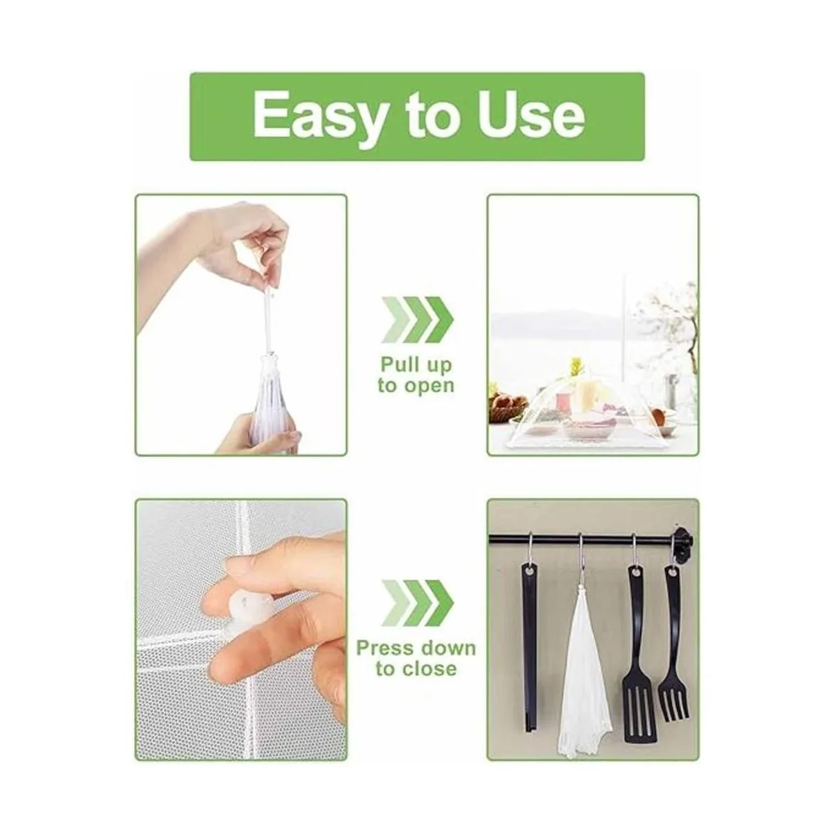 Fácil de abrir y plegar: plegable y reutilizable, bonito diseño inteligente de paraguas es extremadamente fácil de abrir y plegar para almacenamiento, fácil de limpiar, lavable a mano, cuando se fija alimentos en ellos, simplemente enjuaga en un poco de agua fría, sumerge en agua tibia y jabón, abre y seca al aire.