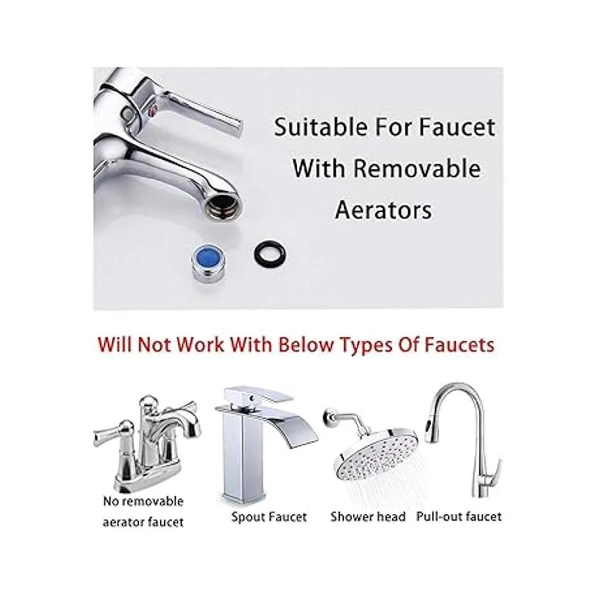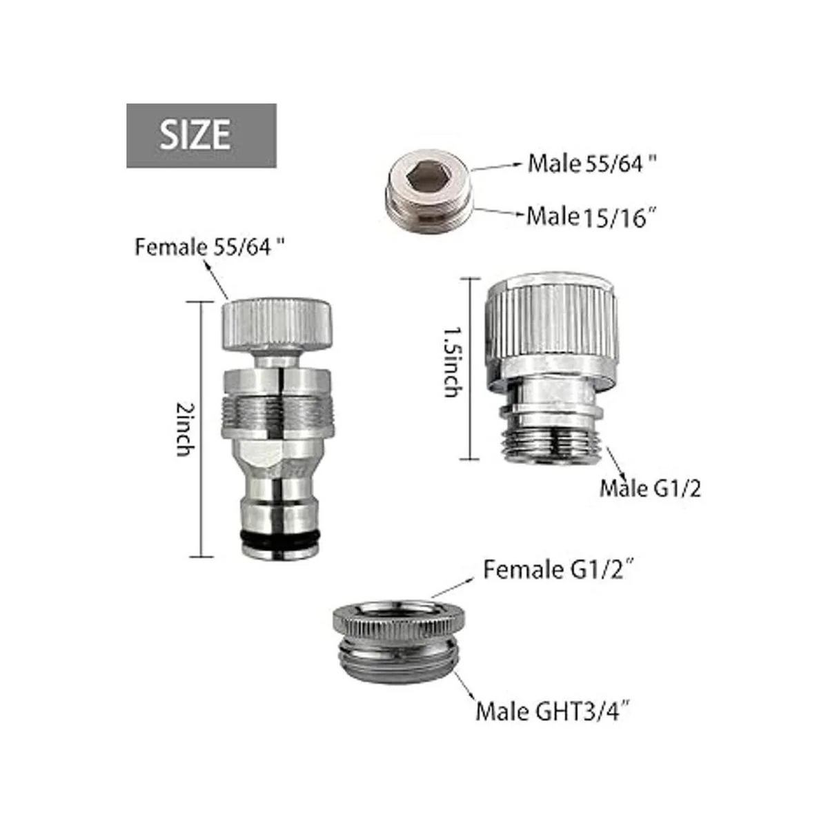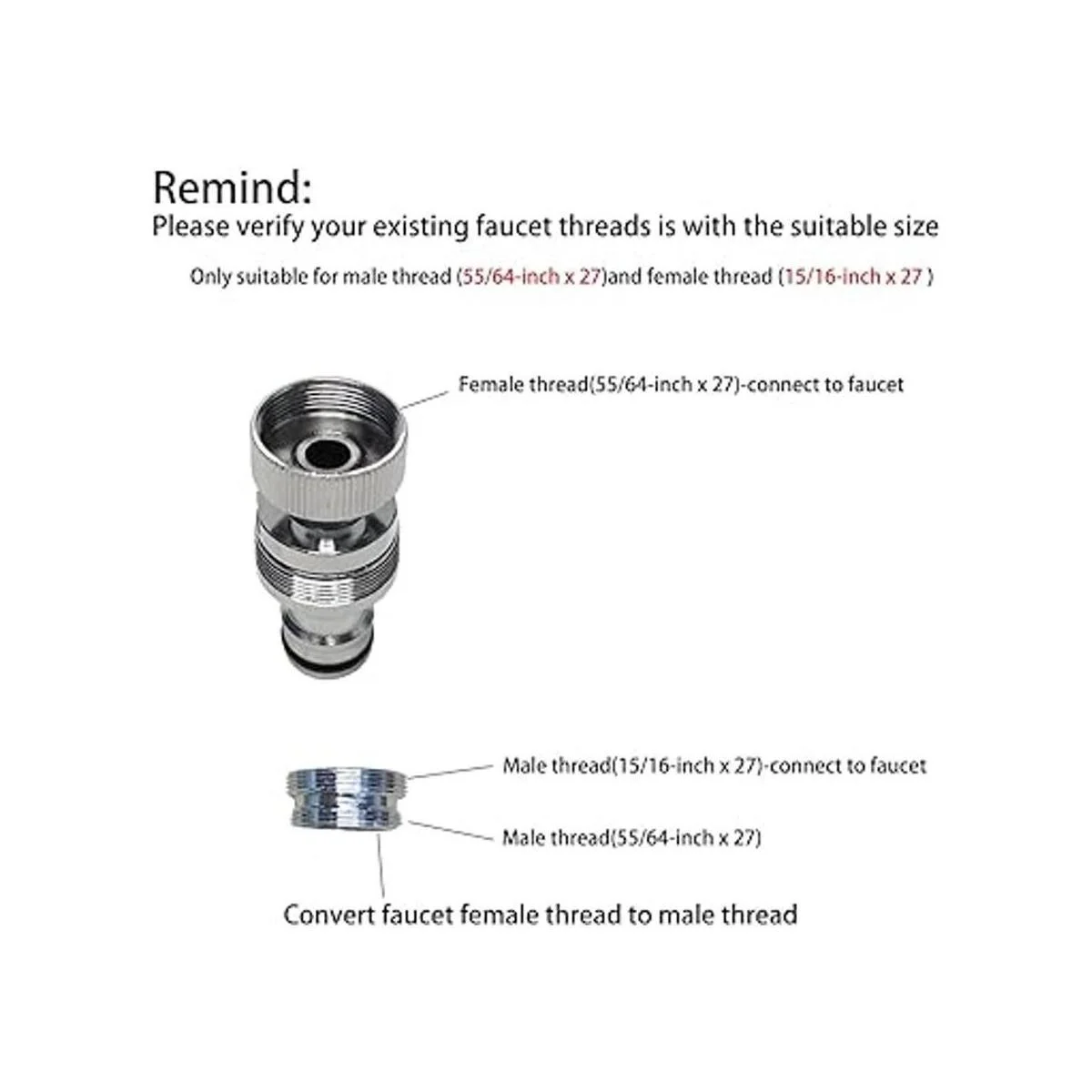 Tamaño de conexión general: el conector rápido tiene rosca interna de 55/64 pulgadas 27, adecuado para grifo de rosca hembra M22 55/64 pulgadas 27. Incluye un adaptador de rosca hembra adicional M22 x M24, que es macho de 15/16 pulgadas 27 superior y macho de 55/64 pulgadas 27 inferior, adecuado para grifo roscado interno M24 15/16 pulgadas 27. Solo se conecta a cualquier grifo de fregadero con un aireador desmontable. Comprueba el tamaño de tu grifo antes de comprar.