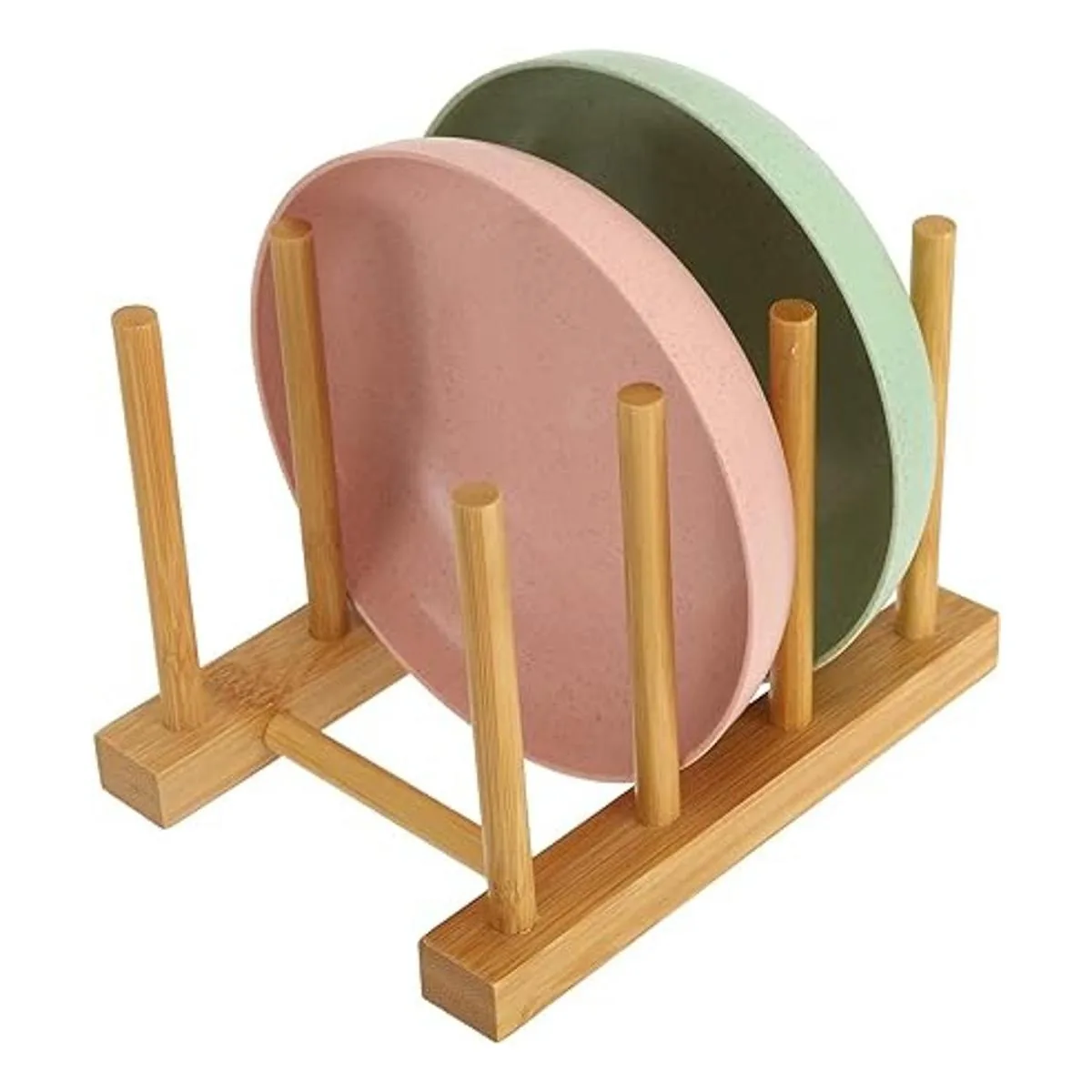 Lawei Juego de 4 estantes de bambú para platos – 3 ranuras para tabla de cortar estante para platos, soporte para tapa de olla para cuencos, tazas, tablas de cortar y más