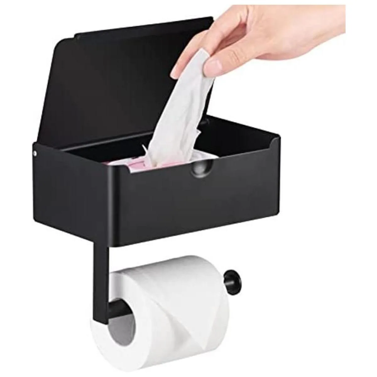 Diseño de almacenamiento de toallitas ocultas: el dispensador integrado de toallitas húmedas de nuestro soporte de papel higiénico con estante puede mantener tus toallitas húmedas ocultas a la vista y evitar que se sequen. También puedes almacenar bolsas de basura, almohadillas menstruales u otras cosas en el estante de almacenamiento con tapa para un acceso cómodo.