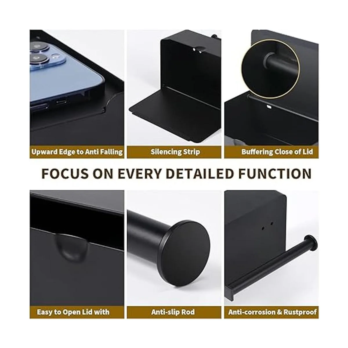Acero inoxidable de alta calidad y acabado negro mate: este soporte de papel higiénico para baño está hecho de acero inoxidable 304 de alta resistencia, que es duradero y resistente al óxido y la corrosión, mientras que ofrece una excelente capacidad de carga. El acabado negro mate hace que el soporte de torre de papel sea suave al tacto y más duradero.
