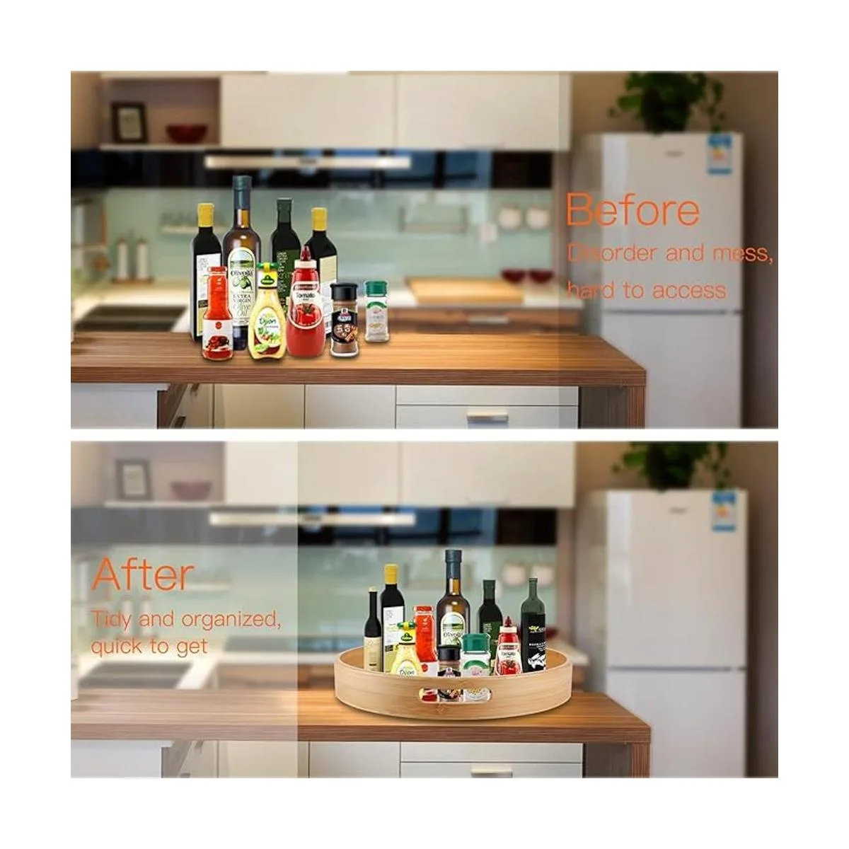 Material natural: organizador Lazy Susan hecho de bambú natural, ligero y fuerte sin olor, fácil de limpiar y muy hermoso. Simplemente lavar a mano o limpiar con un paño húmedo; no remojar en agua ni lavar en el lavavajillas.