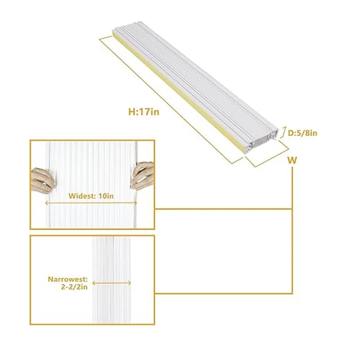 Paquete: incluye 1 rollo de tira de aislamiento de cepillo suave, 1 hoja de instrucciones idioma español no garantizado, 1 sierra de corte, 1 par de paneles laterales, el tamaño es de 17 pulgadas de alto x 10 pulgadas de ancho.