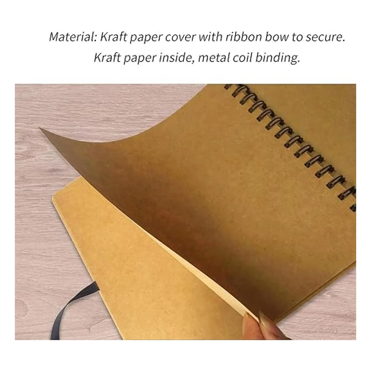 Material: cubierta de papel kraft con lazo de cinta para asegurar. Papel kraft en el interior, encuadernación de bobina de metal.