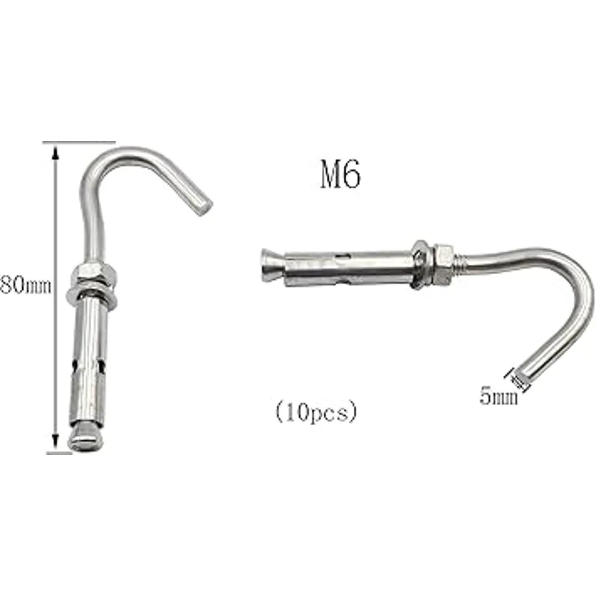 Estos útil gancho de tornillo son fáciles de instalar y usar. Acabado de acero inoxidable 201 ofrece protección contra la corrosión, para una vida útil más larga. Amplia gama de uso, podría ser utilizado en hormigón y mampostería, techo, etc. Especificaciones del producto: M6 de acero inoxidable 201 largo de 85 mm.10 unidades por paquete