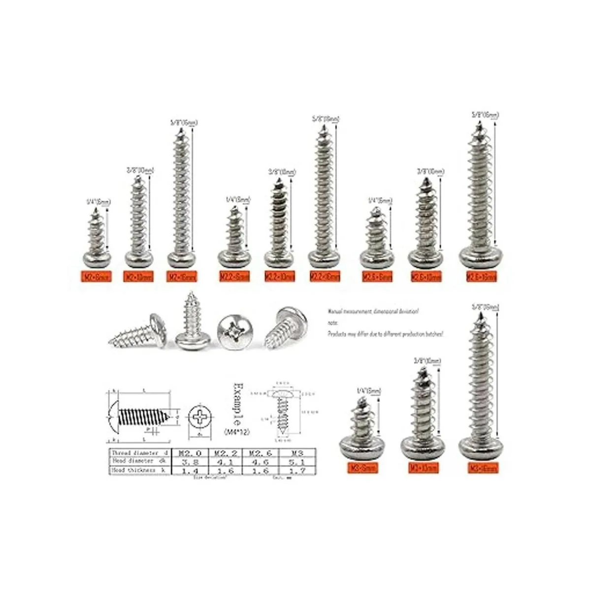 LBY Kit surtido de tornillos de chapa de metal autorroscantes M2.2 M2.6 M3 Philips, 600 unidades, 12 tamaños, acero inoxidable 304
