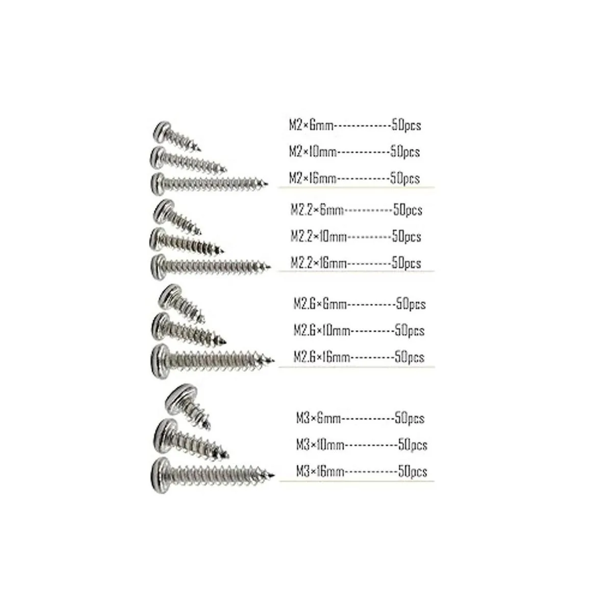 3. Tamaño: M2 x 6 / 10 / 0.630 in, M2.2 x 6 / 10 / 0.630 in, M2.6 x 6 / 10 / 0.630 in, M3 x 6 / 10 / 0.630 in.