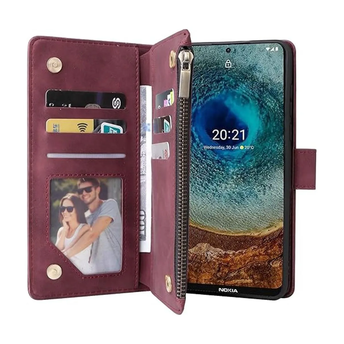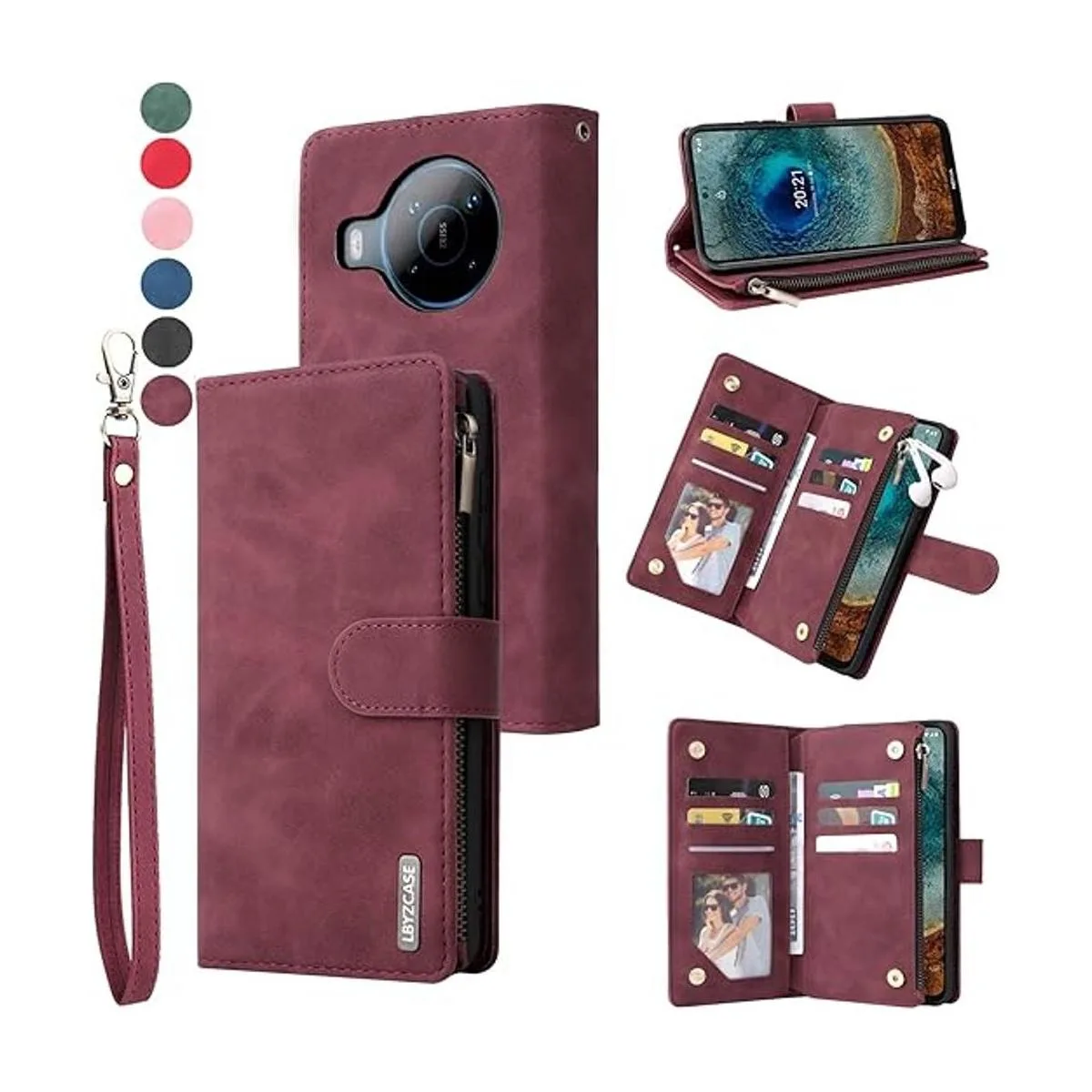 LBYZCASE Funda para Nokia X100 con tarjetero, funda magnética duradera de lujo con cierre de piel, correa de muñeca con función atril, para mujer y hombre, funda para Nokia X100 rojo vino