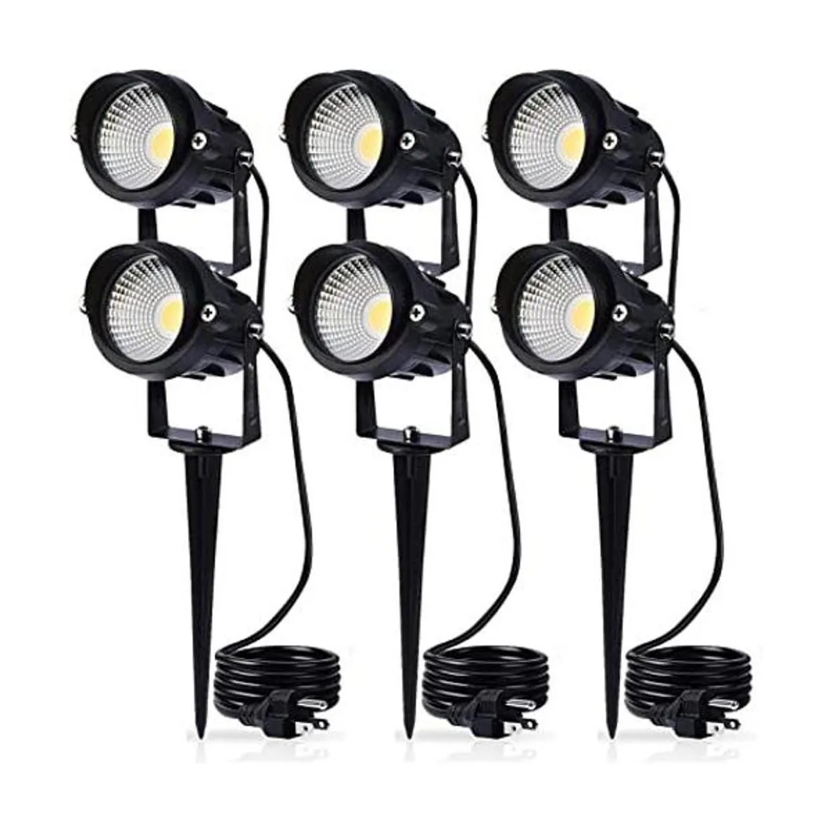 LCARED Foco LED para exteriores, luces de paisaje para exteriores, color blanco cálido, 120 V CA, impermeables, para jardín, patio con estaca con puntos, césped, pared, inundación, iluminación de bandera de entrada con 3 enchufes de EE. UU. paquete de 6