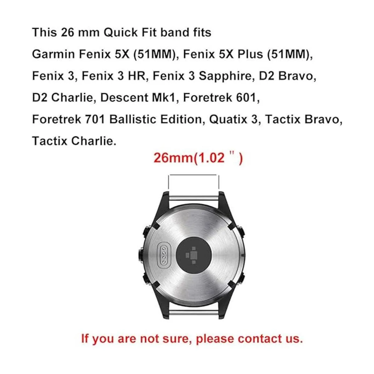 La correa de reloj reemplazable de 1.024 in es compatible con Garmin Fenix 5X, Fenix 5X Plus, Fenix 3, Fenix 3 HR, Fenix 3 Sapphire, D2 Delta PX, D2 Bravo, D2 Charlie, Descent Mk1, Foretrek 601, Foretrek 701 Ballistic Edition, Quatix 3, Tactix Bravo, Tactix Charlix Charlix e, Fenix 6X, Fenix 6X Pro y Sapphire Editions