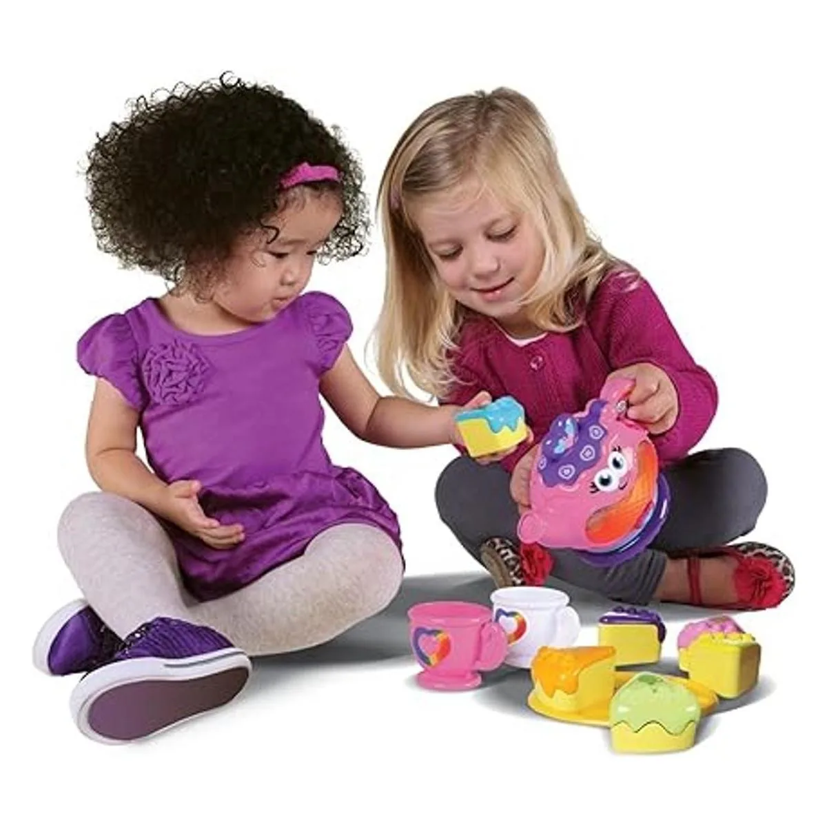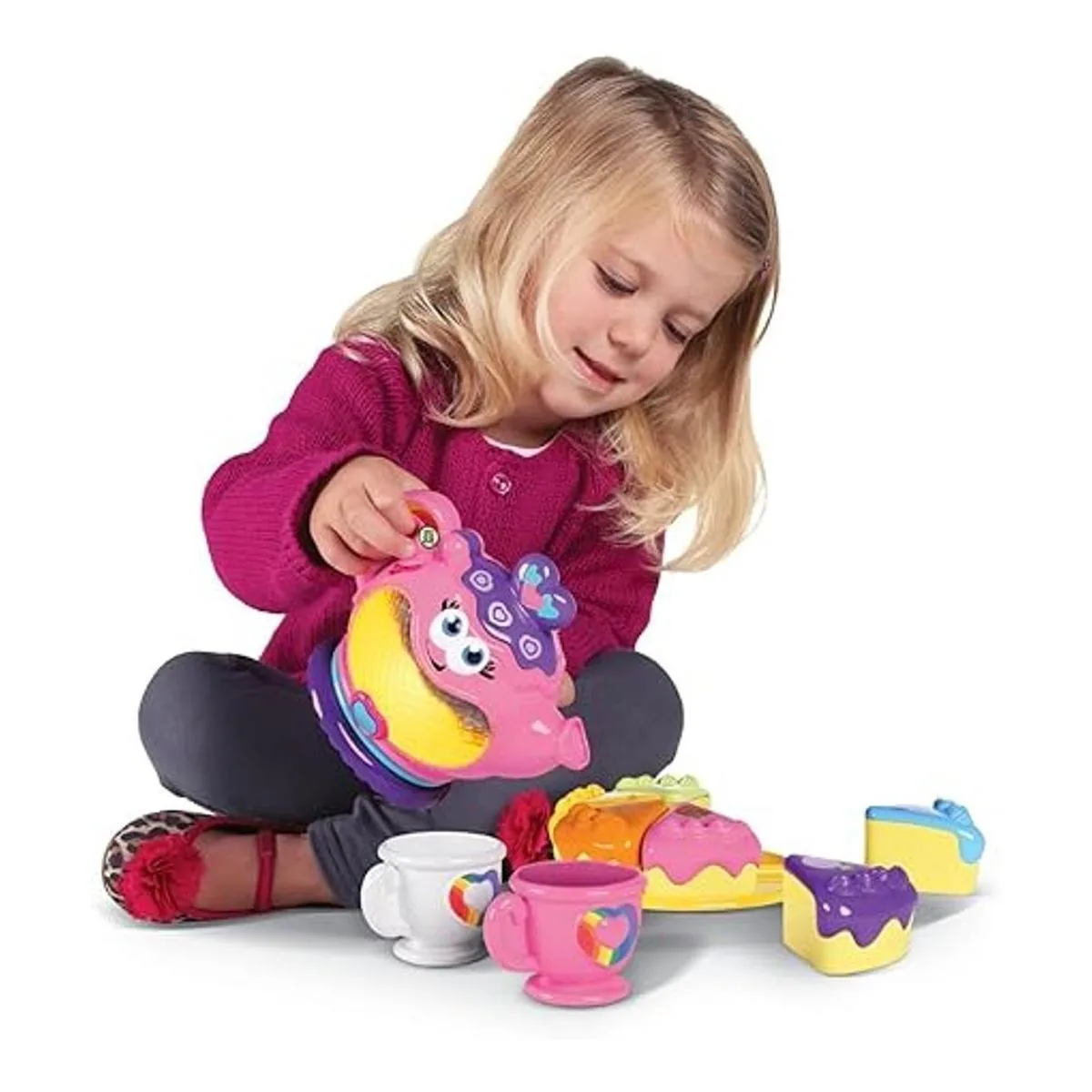 Musical Rainbow Tea Party es un juego de 10 piezas que se ilumina en seis colores y cuenta con canciones y sorpresas