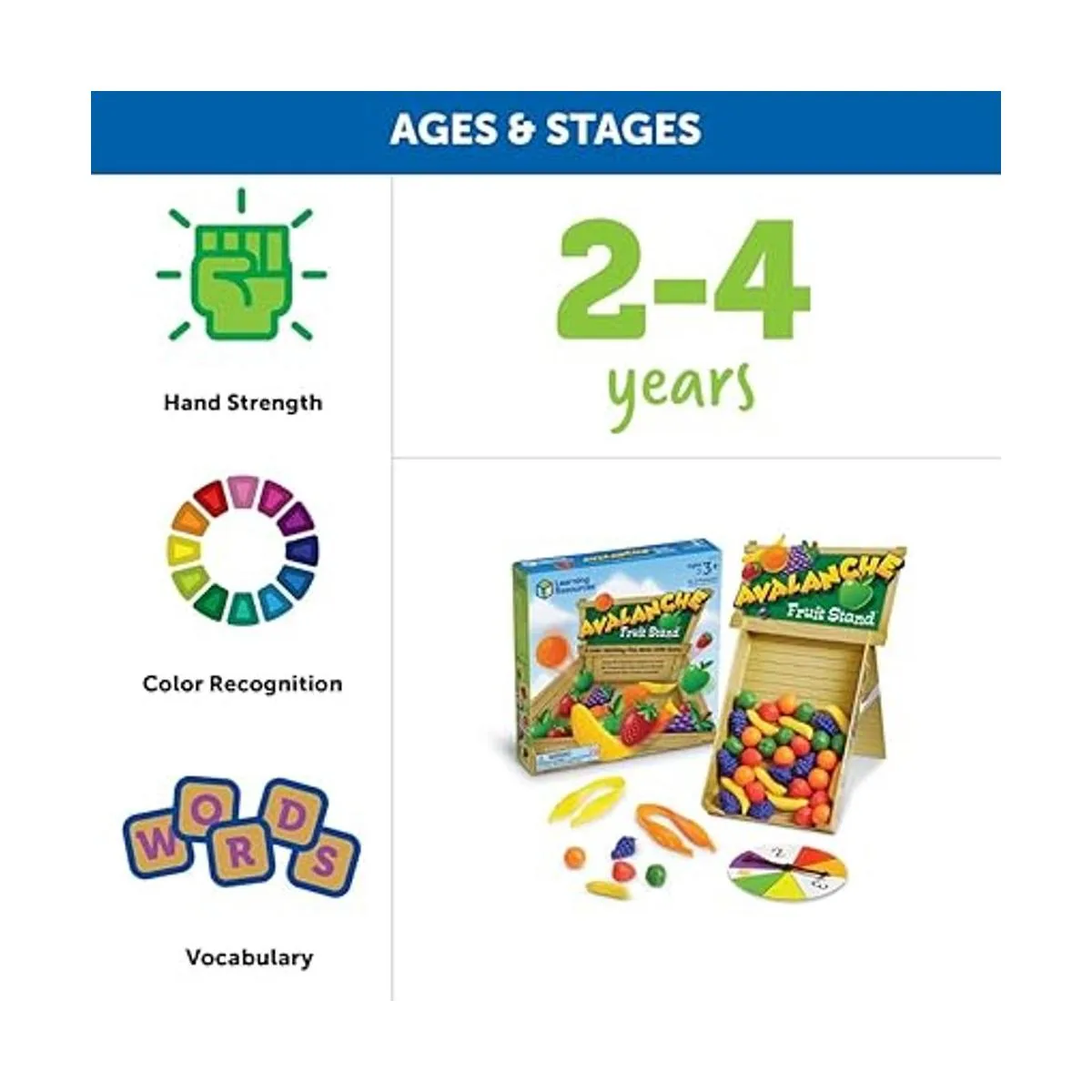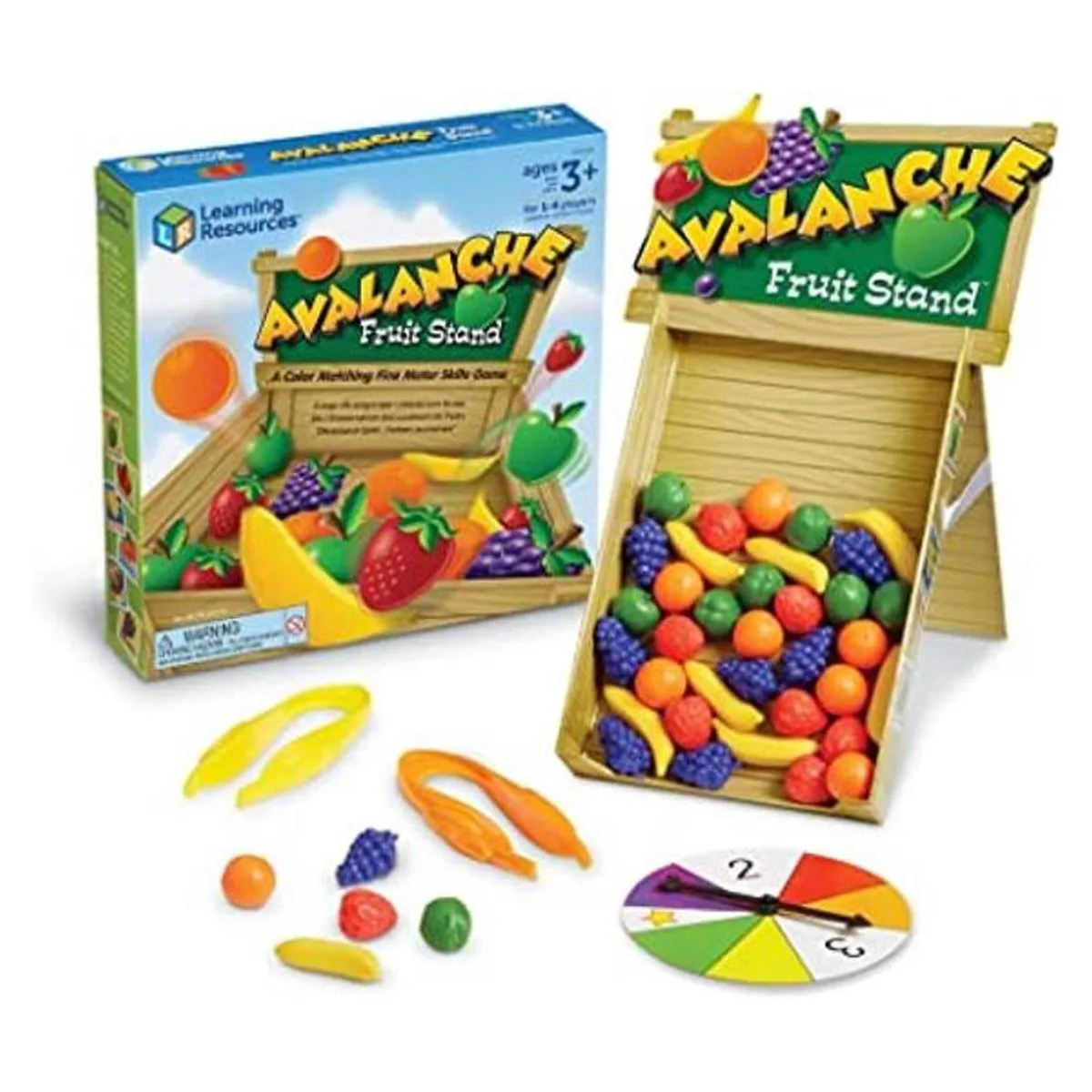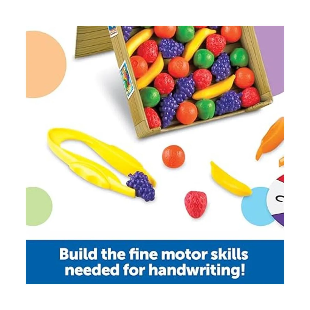 El juego incluye 40 contadores de frutas, 2 pinzas, giratorio de cuadros y soporte de cartón ajustable