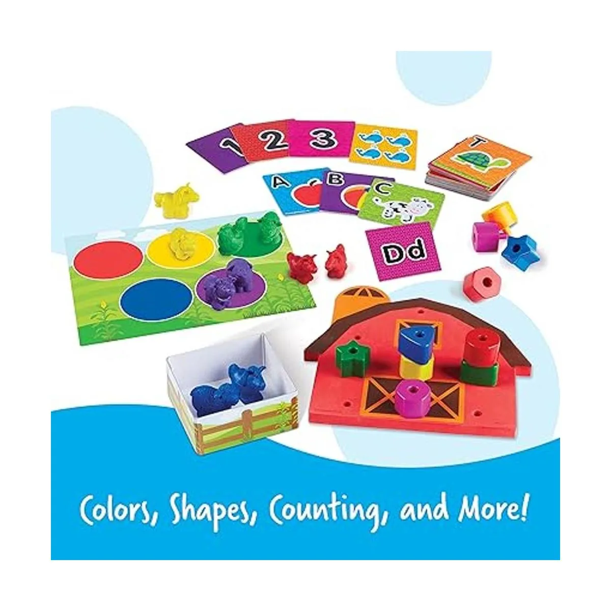 El juego incluye: 10 contadores de granja jumbo, corral, alfombrilla de espuma con temática de granero con 10 clavijas de forma apilable, 26 tarjetas de imagen del alfabeto, 10 tarjetas de números y contar, alfombrilla de actividad de color y conteo 10 pies de largo x 9 pies de alto, guía para padres