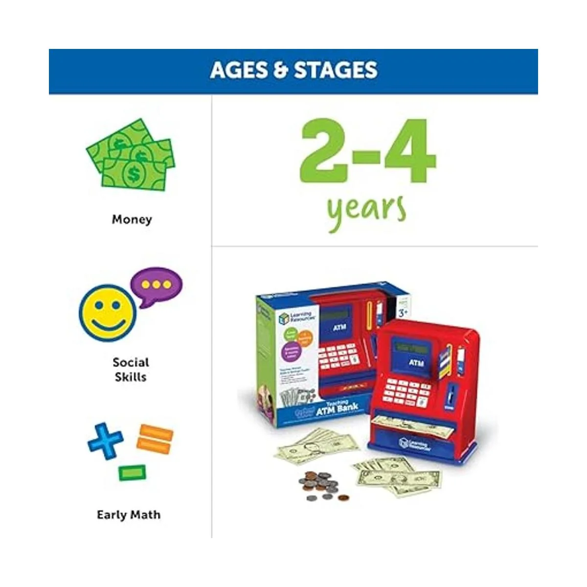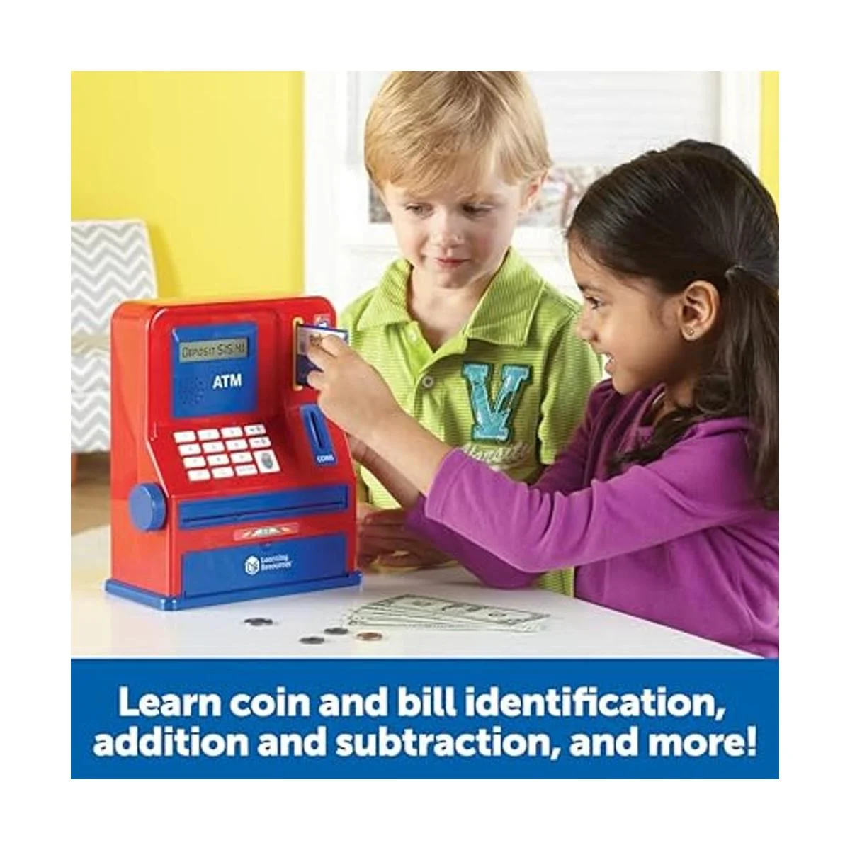 Diseñado para verse y funcionar como un cajero automático real, los niños pueden desarrollar habilidades vitales de dinero, incluyendo identificación de monedas y facturas, suma, resta y valor de lugar.