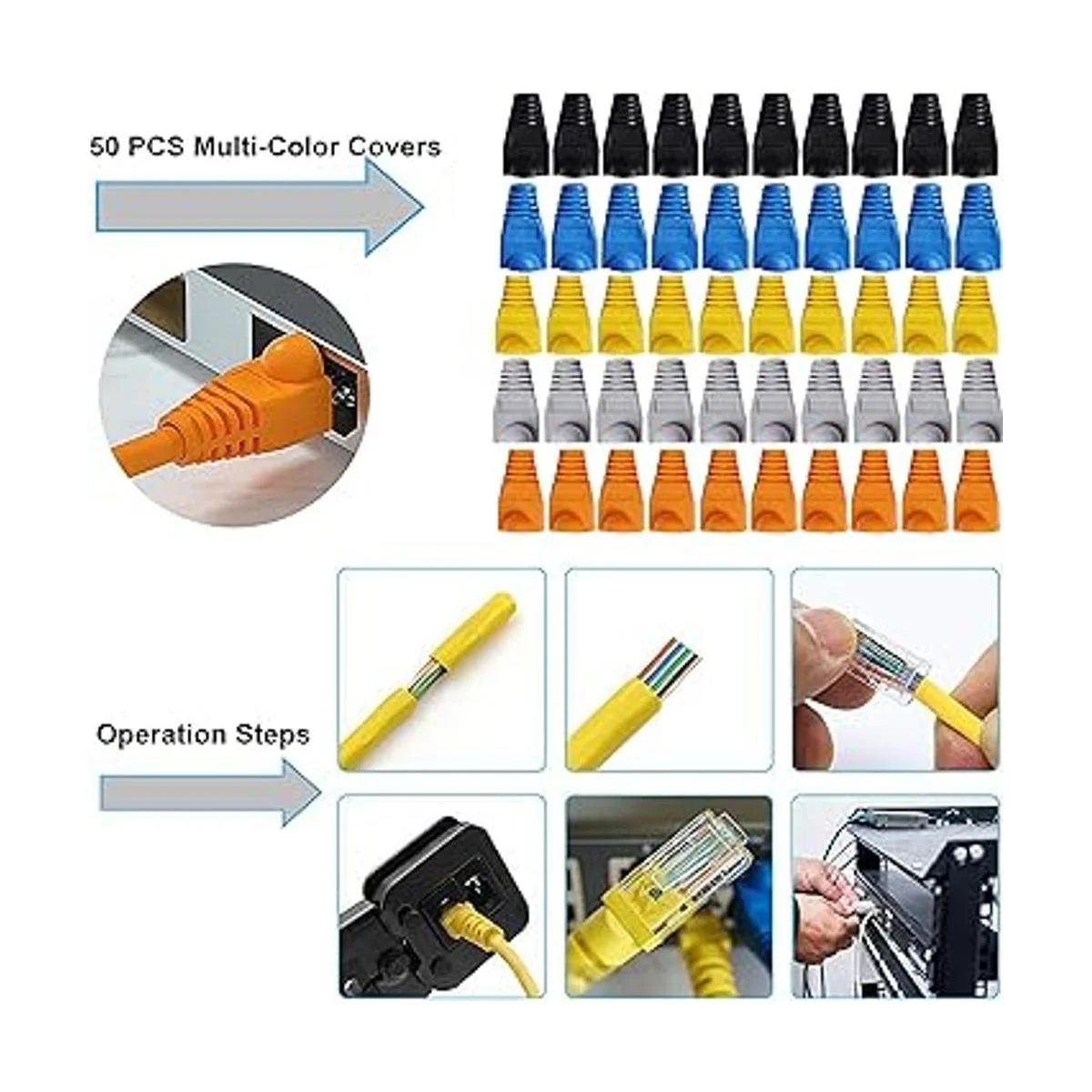 LEATBUY Juego de herramientas de crimpado RJ45 Cat5e Cat6 RJ45, juego de herramientas de crimpado Cat5, Cat5e, Cat6, 50 conectores de paso RJ45, Cat6, 50 cubiertas, probador de cables de red, cortador de perforación de alambre azul