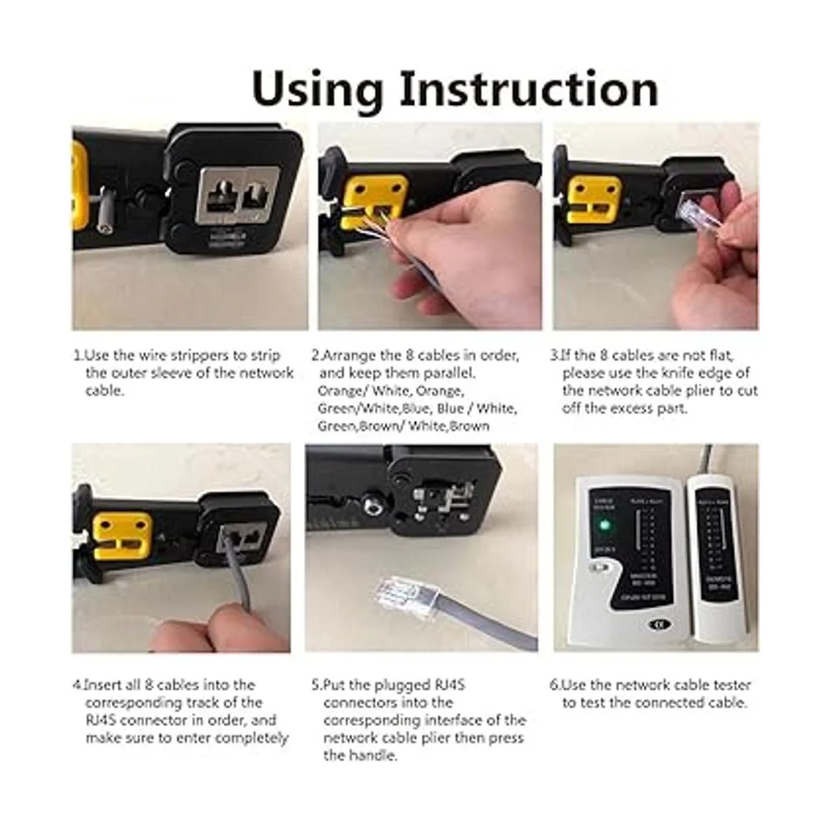 Alta calidad: herramienta de crimpado RJ45 de mayor rendimiento, corta, tira y termina cables de cobre extendidos RJ11/12 y RJ45 con un cabezal de troquel de precisión que proporciona 360 grados de soporte del conector durante el ciclo de crimpado. Más potente que otros cuando conectas kits de reparación en red en el mercado.