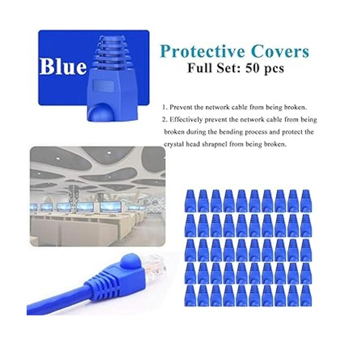 LEATBUY RJ45 Juego de herramientas de crimpado Cat5 Cat5e Kit de herramientas de crimpado Cat6 para paso RJ11RJ12 para paso de extremo regular con 50 conectores, kit de pelacables de red de 50 cubiertas azul