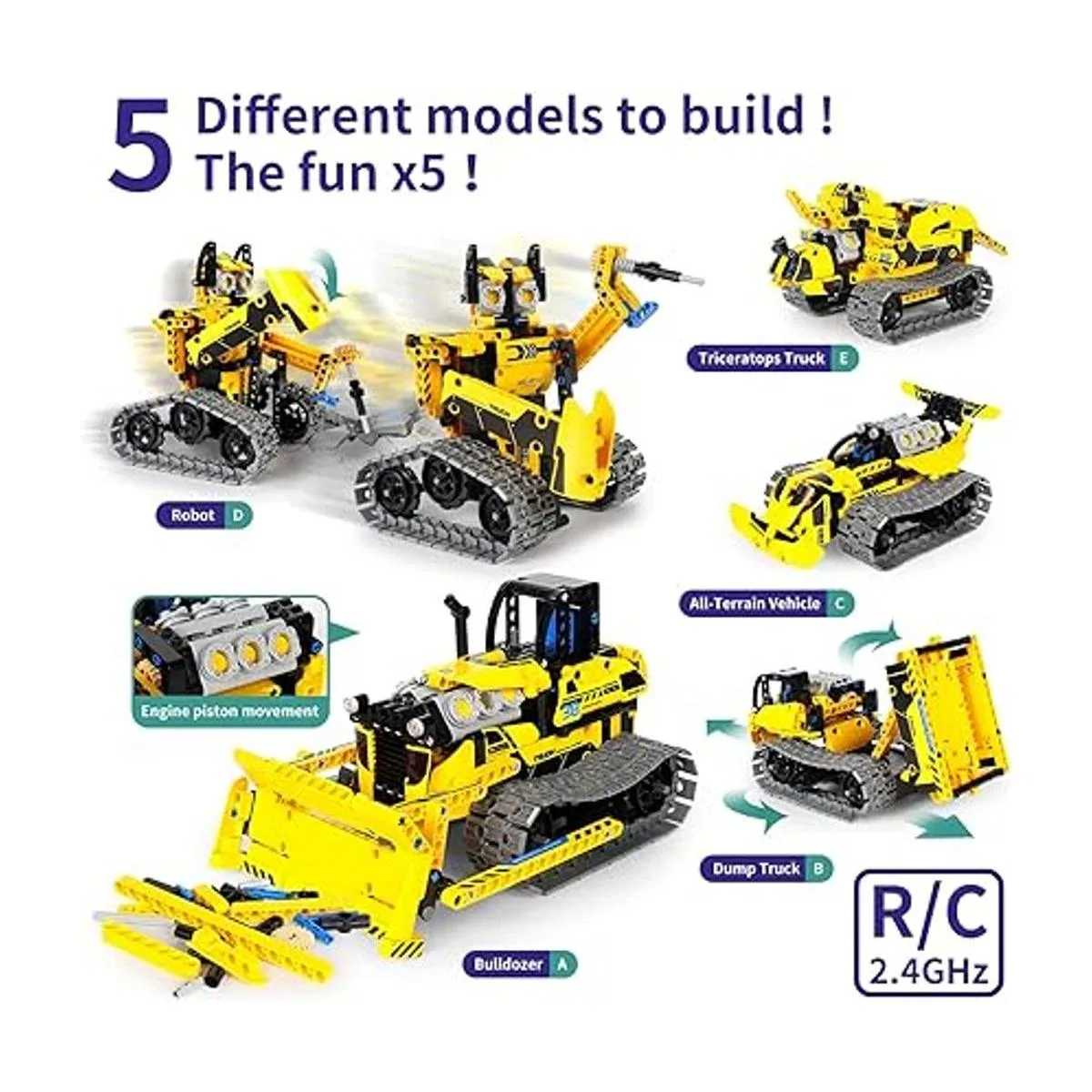 Fácil de usar Bulldozer, robot volquete, camión Triceratops, vehículo todo terreno, juguetes de construcción incluidos con 452 piezas, construye tu propio kit RC uno por uno La diversión x5