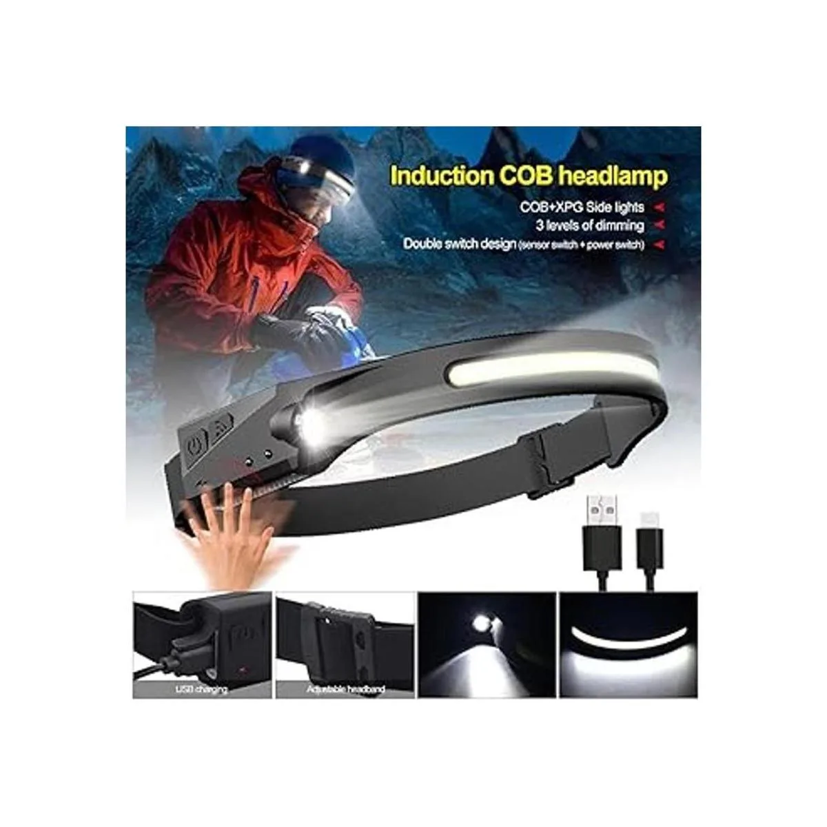 LED de haz ancho recargable, faro con sensor de movimiento, 5 niveles de luz, diseño ligero para correr, al aire libre, campamento, pesca, trabajo mecánico automático, fijación de electrodomésticos, fontanería, electricidad