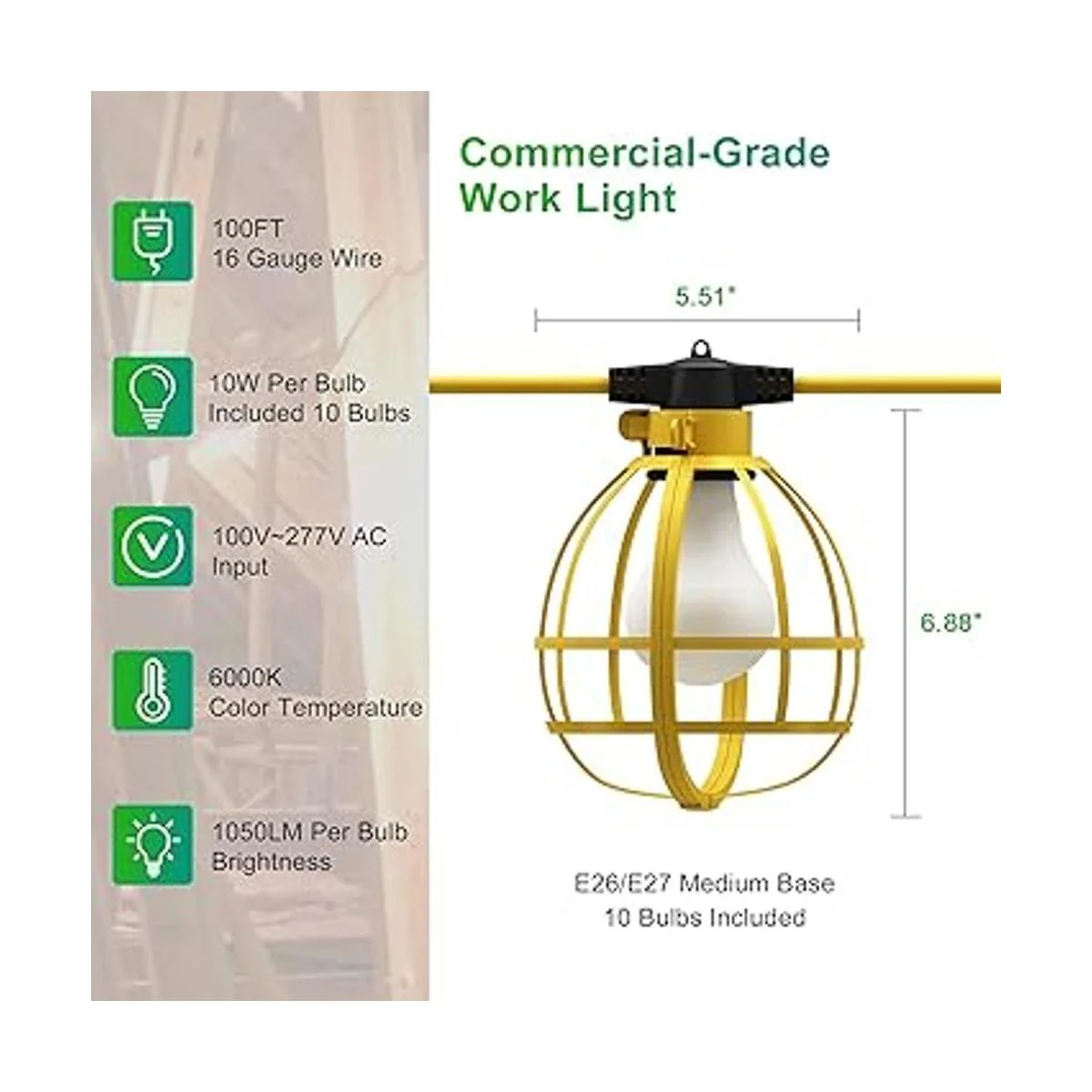 LEDIARY Cadena de luces de construcción de 100 pies, 10 bombillas de 100 W, 10500 lúmenes, tira de luces de trabajo con 10 enchufes de base media, luces enlazables, iluminación temporal resistente a la intemperie en interiores y exteriores, certificación UL