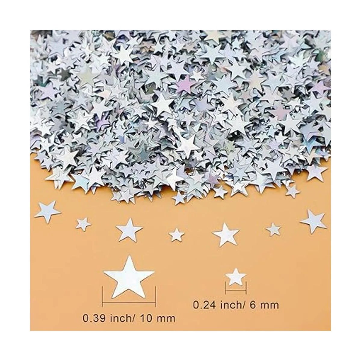 El paquete incluye: 1 paquete de 2.12 oz de confeti en forma de estrella, la cantidad es suficiente para satisfacer tus necesidades básicas para bodas y fiestas. Viene con 2 tamaños, una talla es de aprox. 0.236 in y otros tamaños son de aprox. 0.394 in, que es pequeño en tamaño y ligero en peso, muy cómodo de llevar.