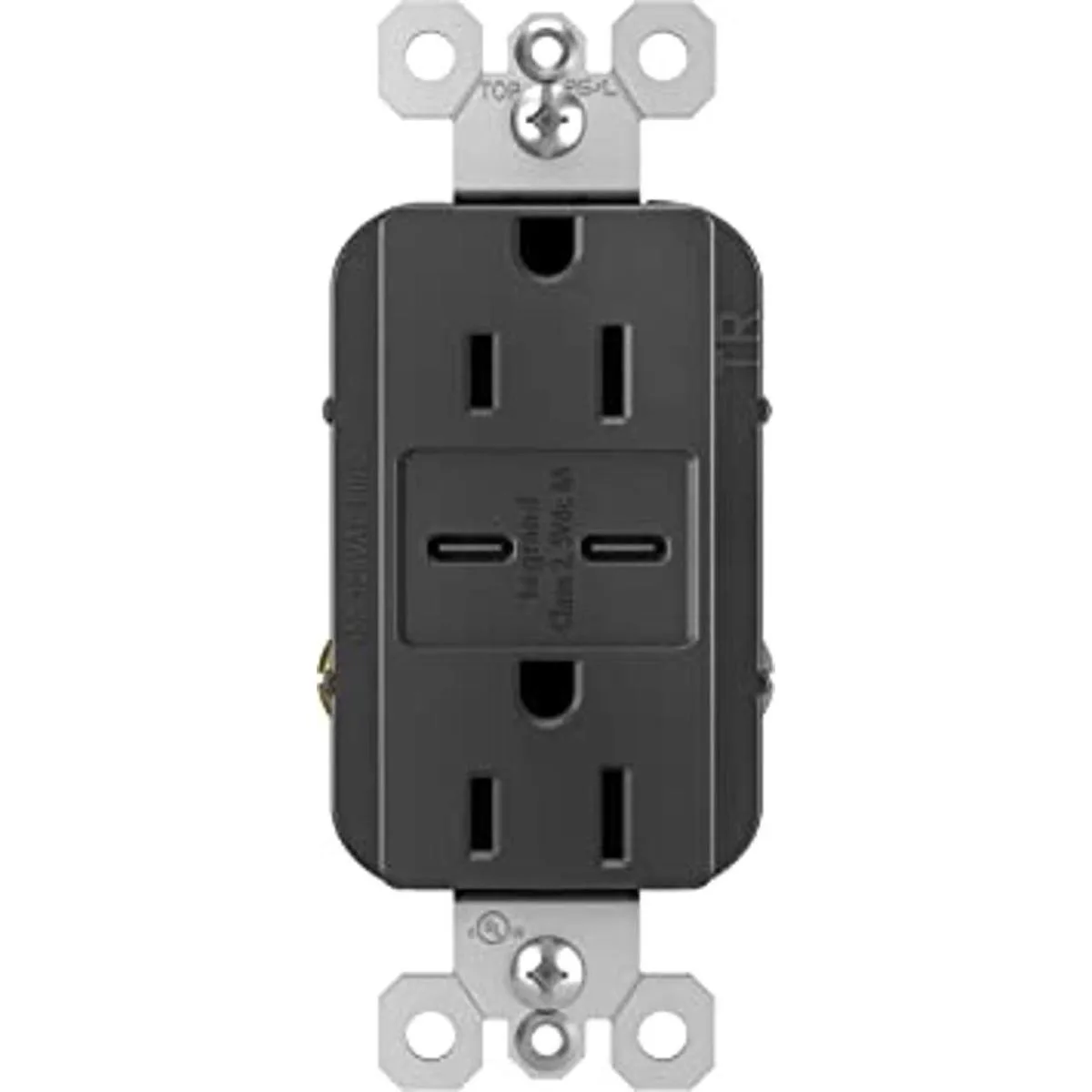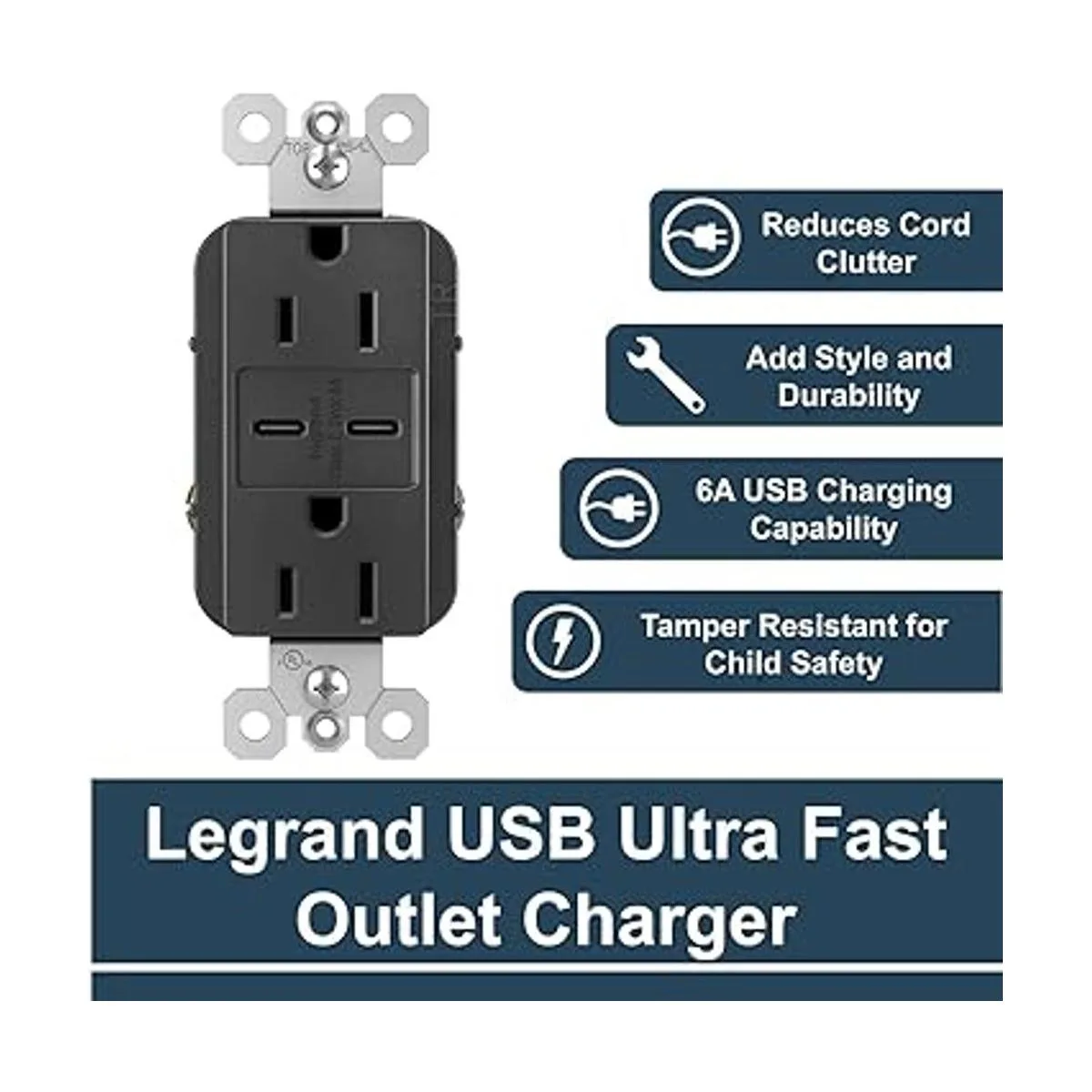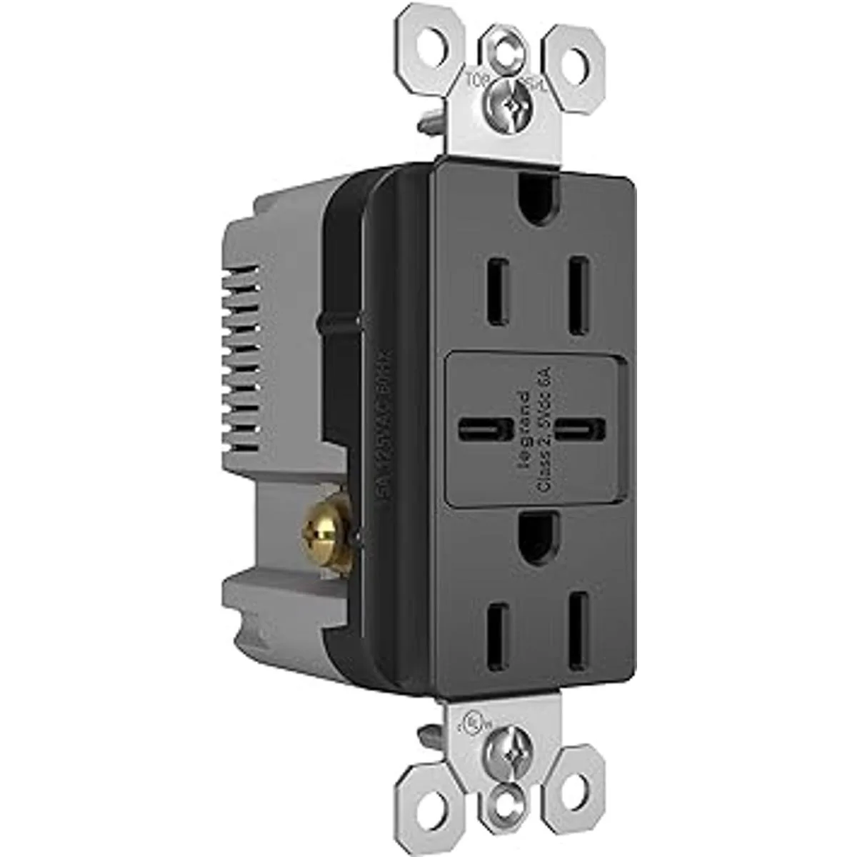 Legrand Salida de pared decorativa radiante de 15 amperios con cargador USB de 6.0 amperios, carga ultrarrápida, puerto múltiple, negro, USBC, R26USBCC6BK
