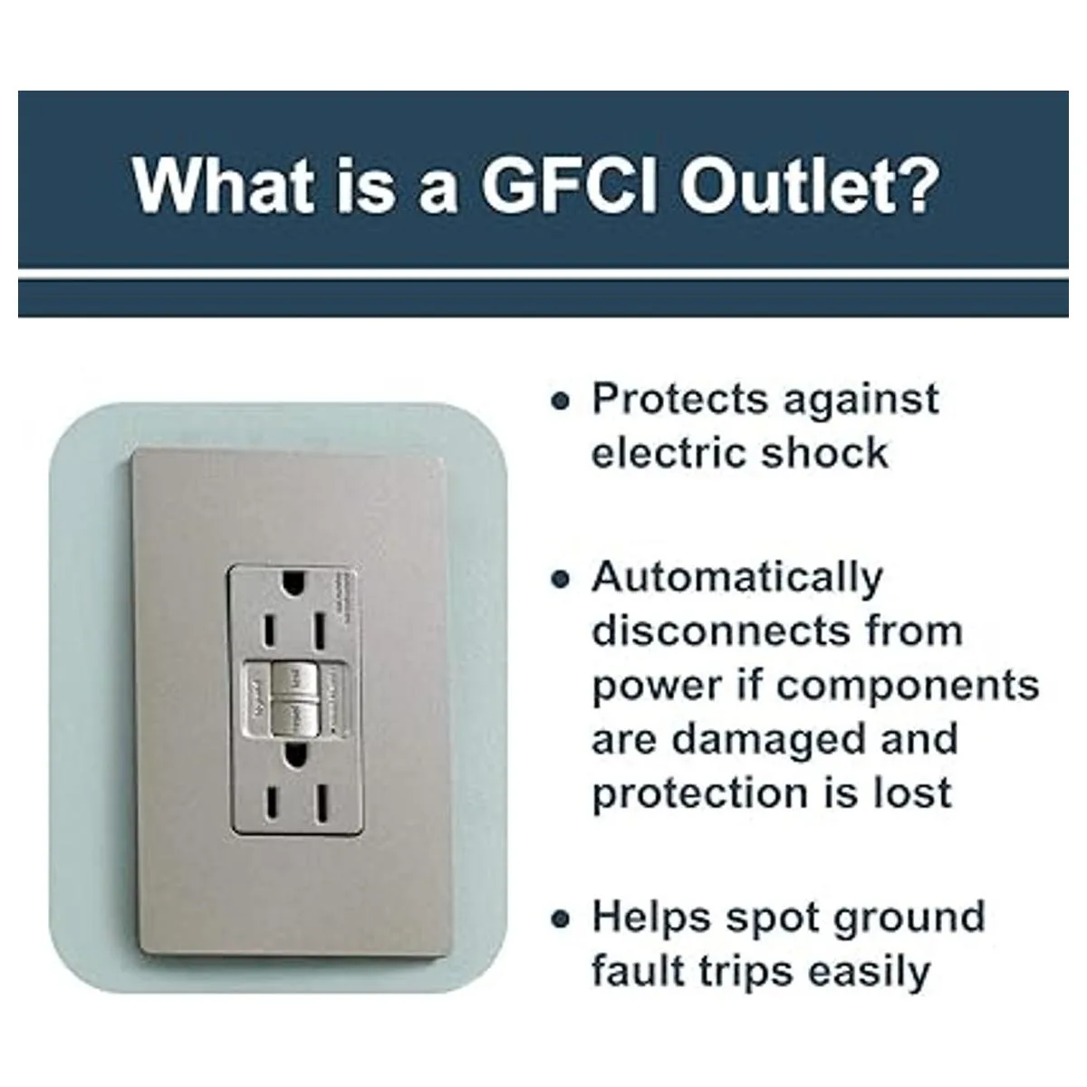 Actualiza sin problemas tu vieja toma de corriente de cocina o baño con una nueva toma GFCI resistente a manipulaciones que protege contra lesiones de descargas eléctricas y se desconecta de la energía cuando se pierde protección.