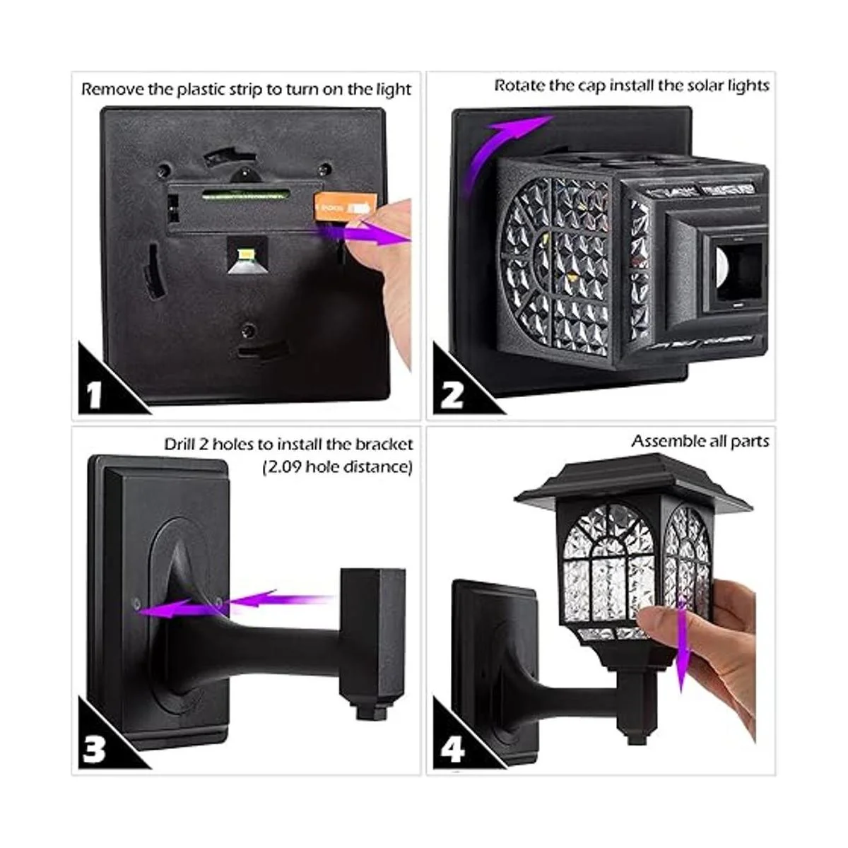 Fácil de instalar: simplemente retira la tira de plástico para encender el interruptor debajo de la tapa, el panel solar detectará cambios en el brillo, estas luces solares se encienden automáticamente por la noche y se apagan al amanecer. Utiliza los ganchos ABS que proporcionamos. El panel solar debe recibir luz solar directa