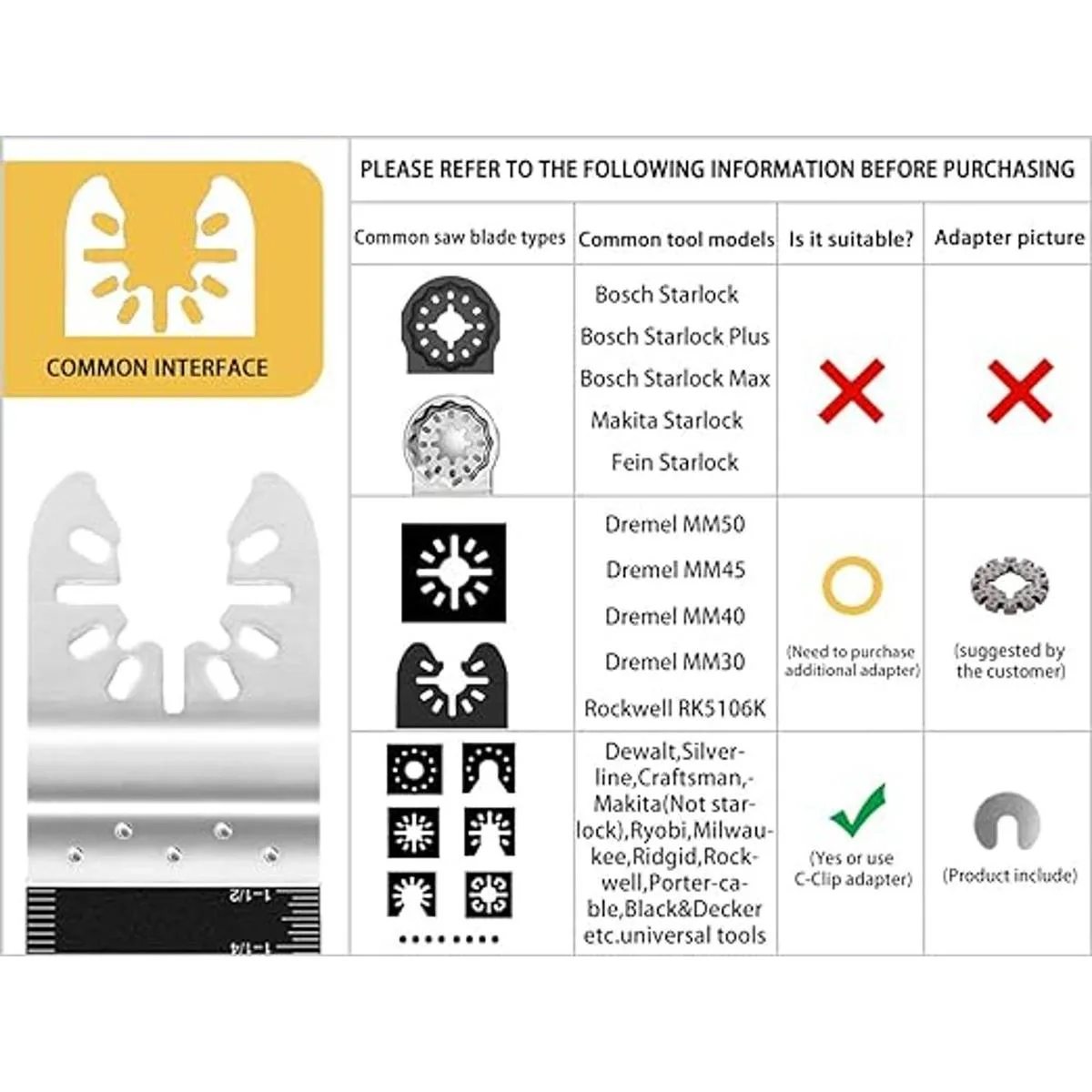 Más compatible: el sistema de interfaz universal está diseñado para ser compatible con más del 95 de la multiherramienta eléctrica en el mercado. Como Fein Multimaster, Ryobi, Milwaukee, Hitachi, Chicago, Craftsman, Dewalt. Más detalles están en la descripción del producto o ponte en contacto con nosotros para confirmarlo.