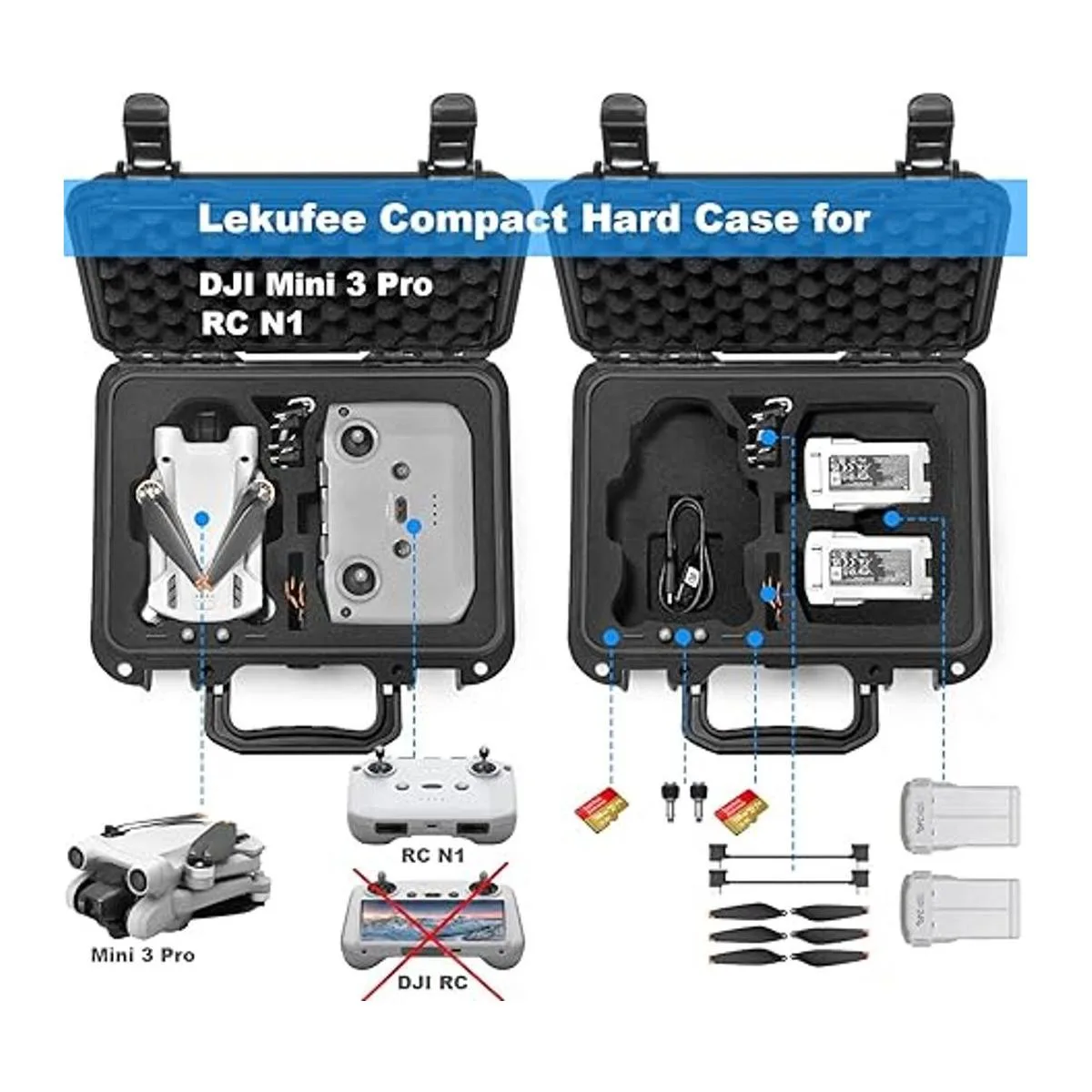 Diseño personalizado: la funda impermeable Lekufee con espuma personalizada está diseñada para accesorios DJI Mini 3 Pro. Puede sostener: 1 dron DJI Mini 3 Pro, 3 baterías DJI Mini 3 Pro Plus incluye batería interior del drón, 1 DJI RCN1 solamente, 2 tarjetas microSD, 3 cables RC, 2 hélices DJI Mini 3 Pro par y 2 palos de control DJI RCN1 par.
