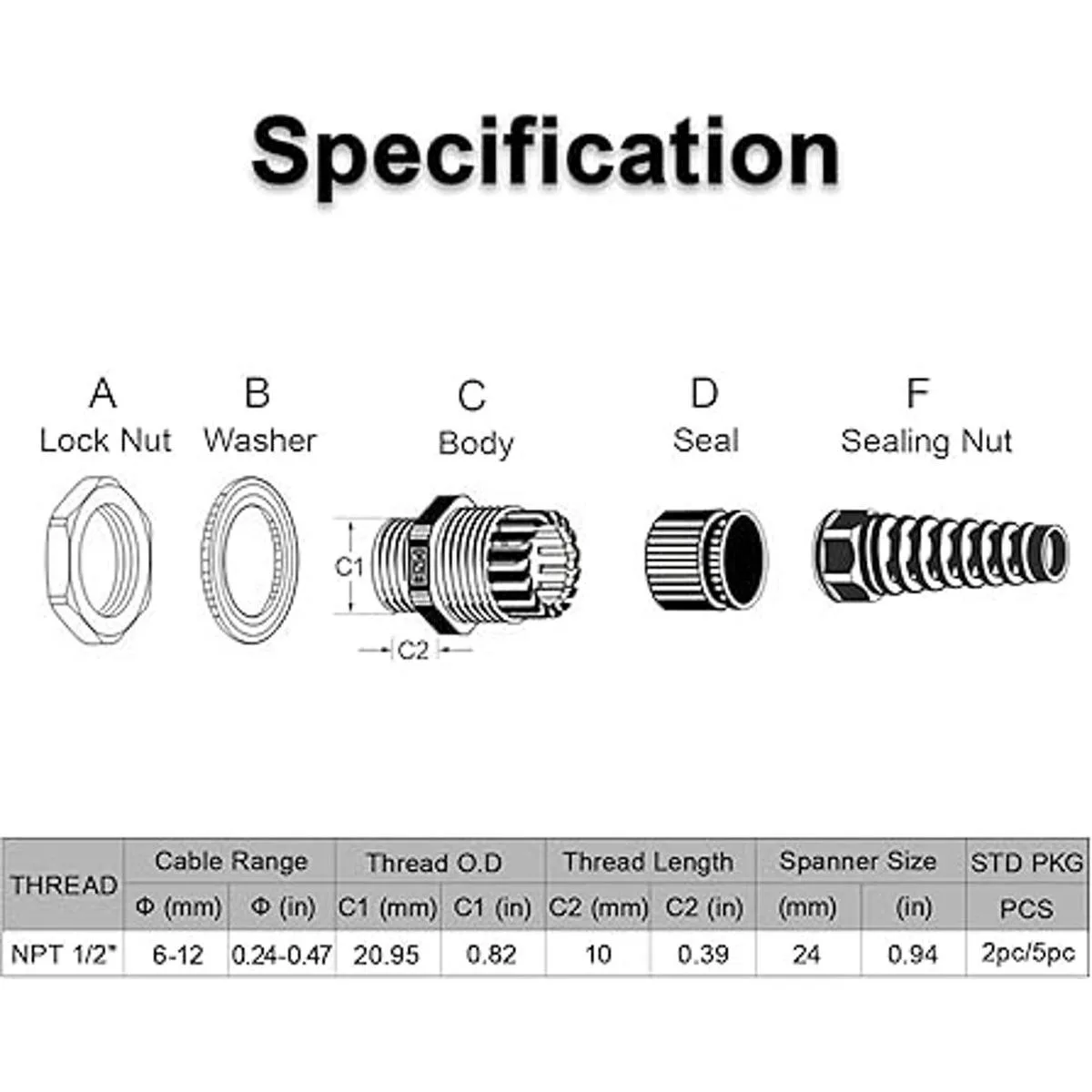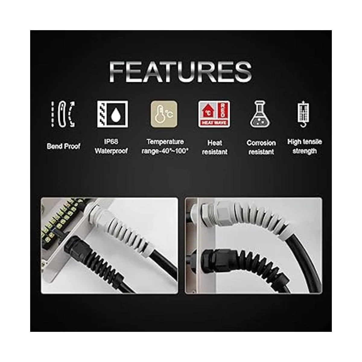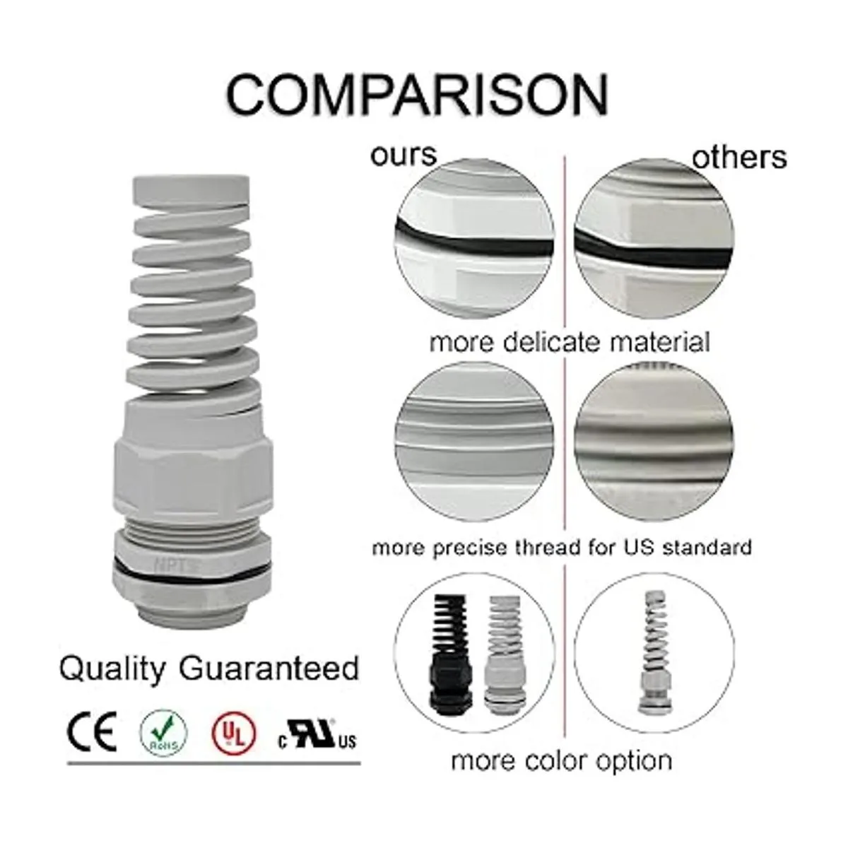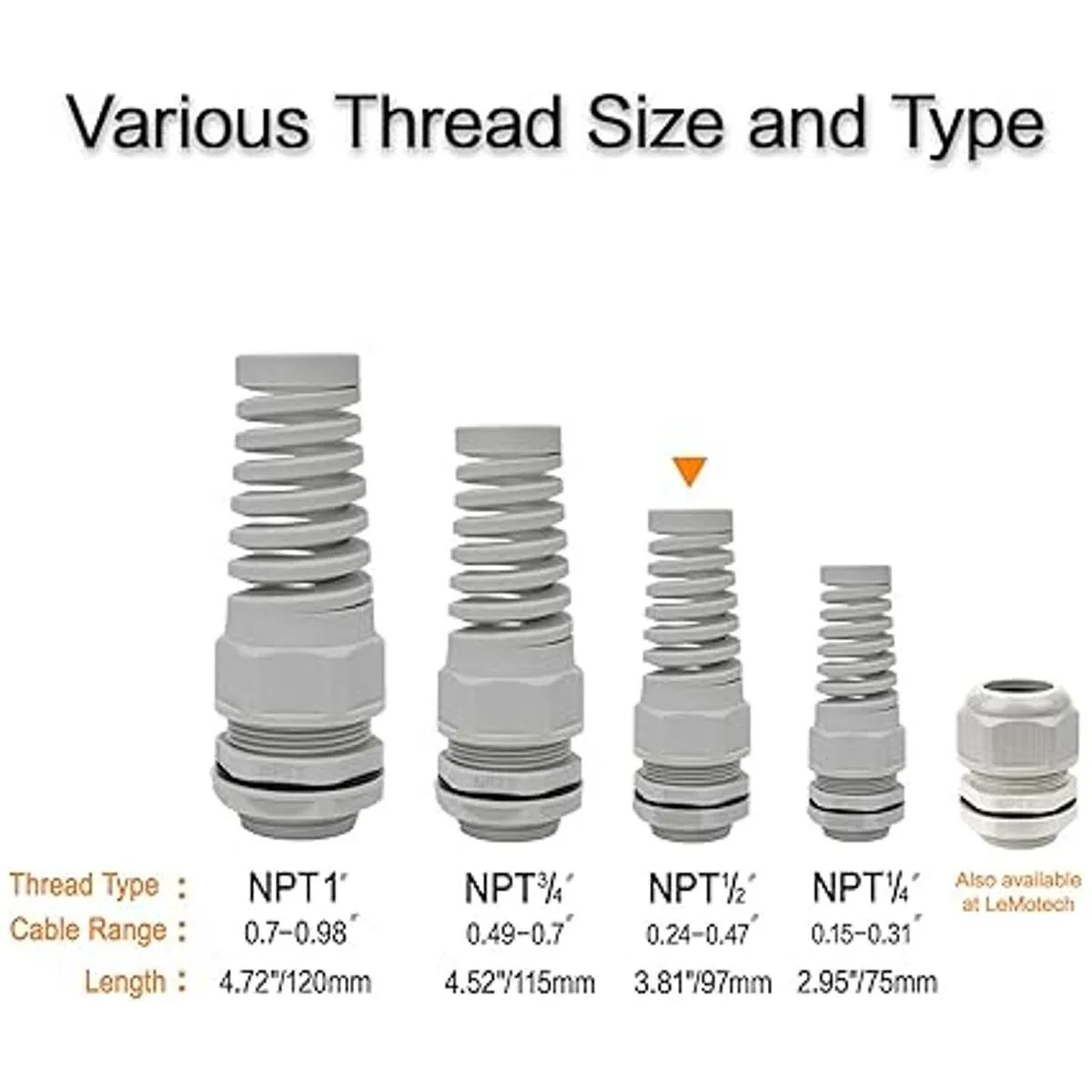 Rosca de prensaestopas NPT: el kit de prensaestopas tiene NPT de 1/2 pulgadas en total. Rango ajustable de alivio de tensión para cables y cables que se conectan a equipos eléctricos, incluyendo cajas de conexiones. El diseño en espiral hace una mejor protección para los cables.