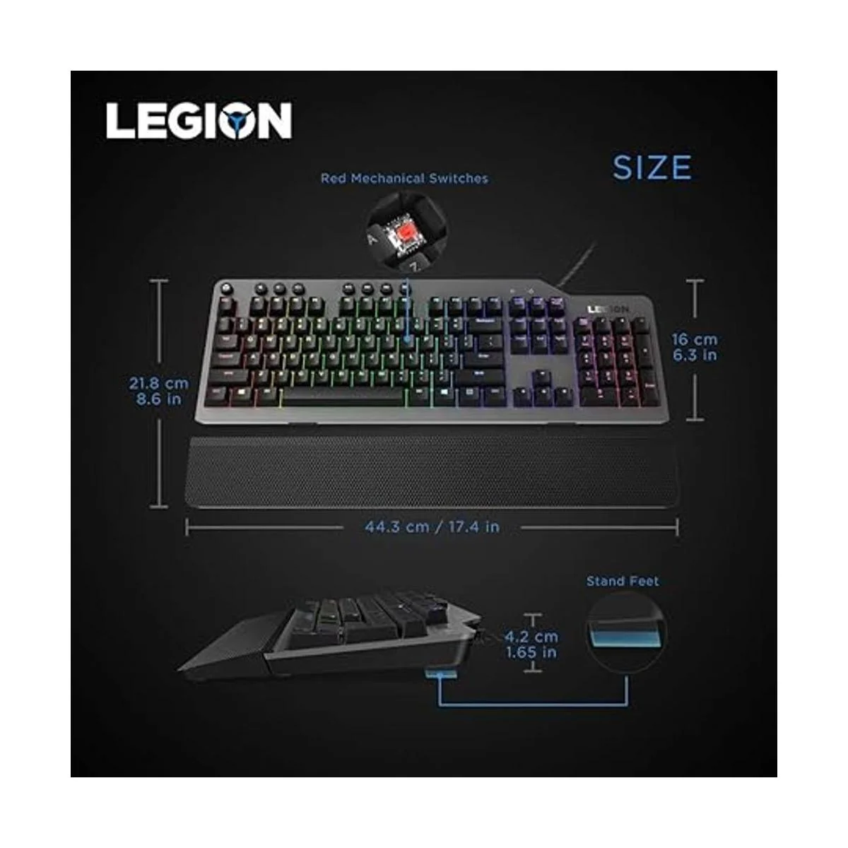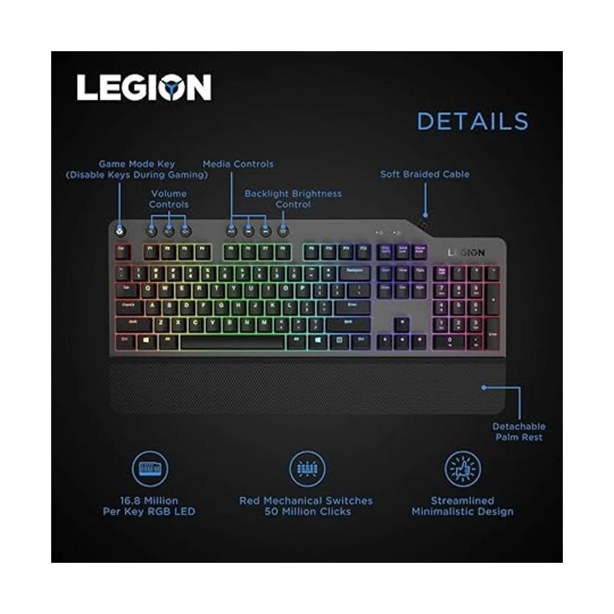 Lenovo GY40T26478 Legion K500 RGB Teclado mecánico para juegos, teclado de tamaño completo de 3 zonas, 7 teclas de acceso rápido programables por el usuario; 16.8 millones de colores, 50 millones de clics de teclas mecánicas rojas, reposamanos desmontable