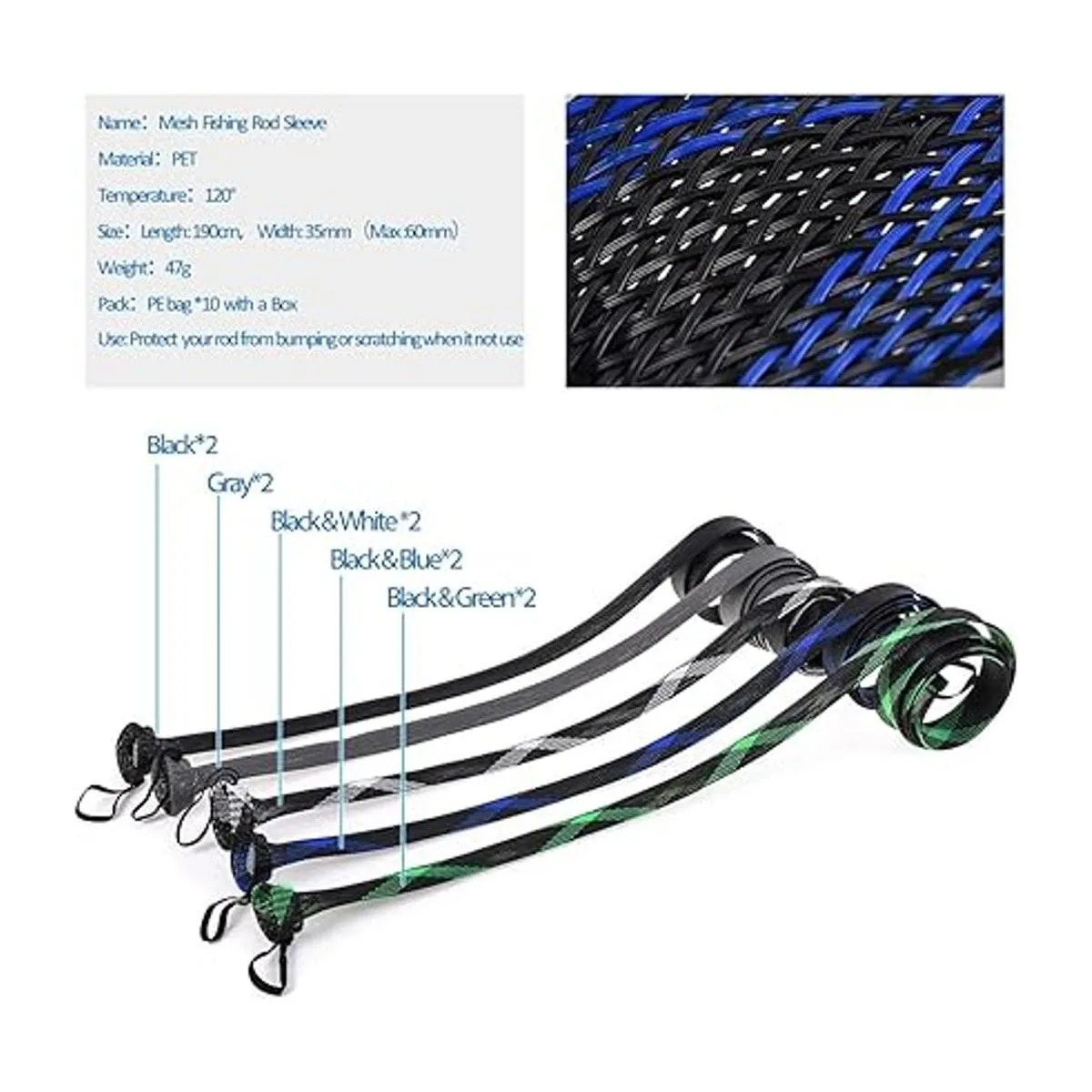 Leo 10 fundas para caña de pescar de 74.8 in de malla trenzada para caña de pescar, guantes de pesca, correa en la parte superior y en el extremo para caña de pescar