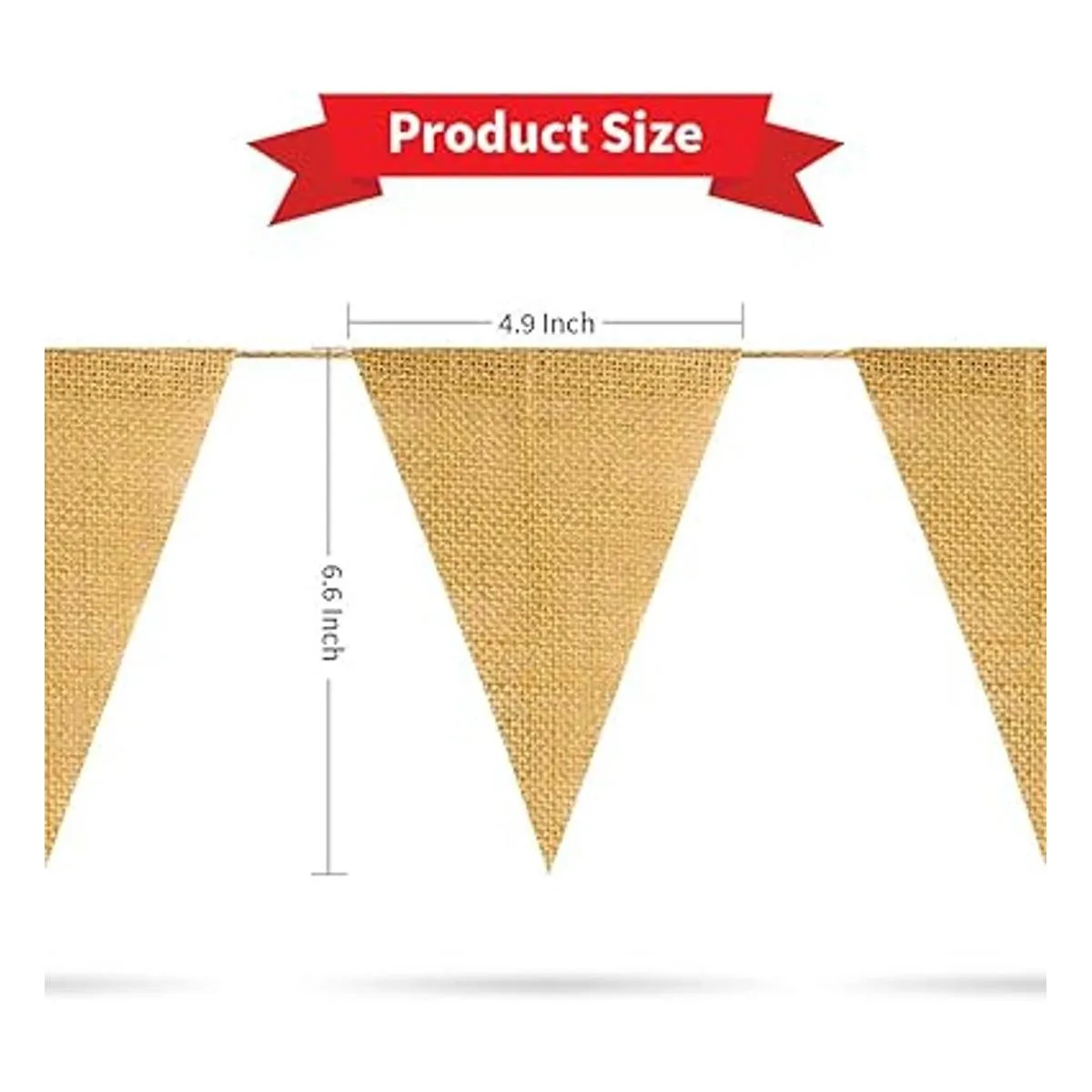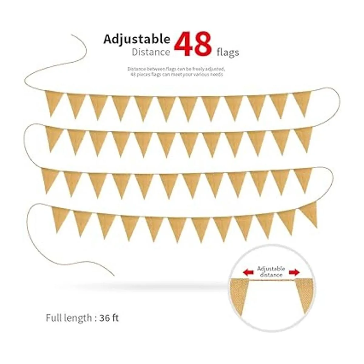 Tamaños decentes: 6.6 x 4.9 pulgadas por pieza, todas las 48 banderas están encordadas por una cuerda de yute, y un total de 36 pies de longitud, puedes cortar la cuerda de acuerdo a tus necesidades prácticas.